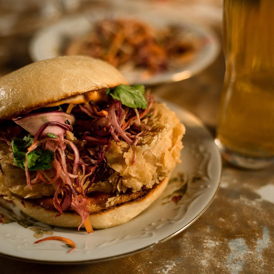 EN: Yeastie Boi's bagel. Si, no tengo pollo - bagel, crispy fried tofu, crunchy slaw and mustard sauce.