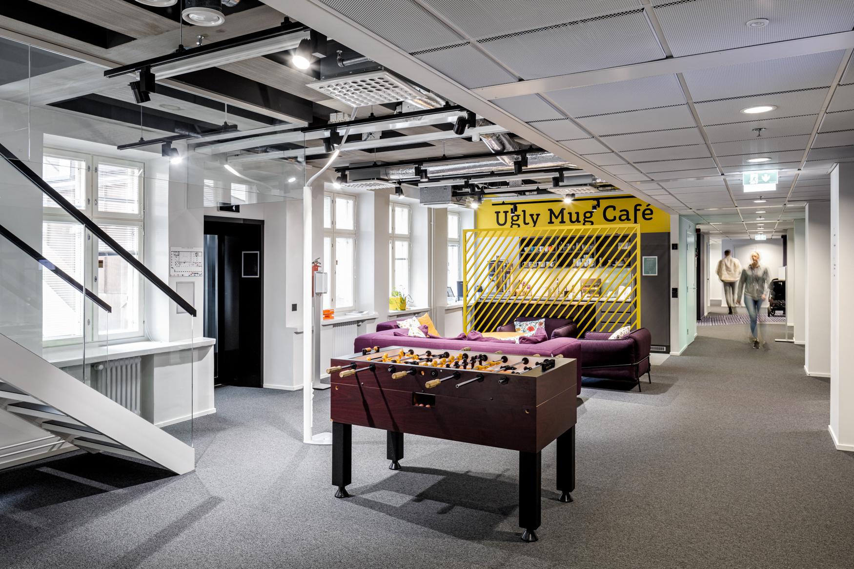 EN: The Ugly Mug Cafe and a table football game in the Epicenter Helsinki common area.