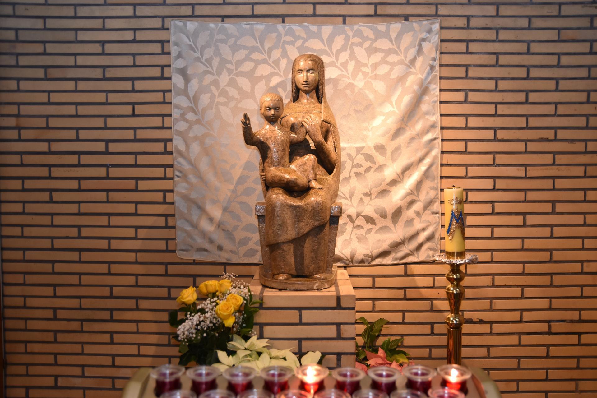 FI: Pyhän Marian kirkon sisätilat. Patsas, jonka edessä on kynttilöitä ja kukkia.
