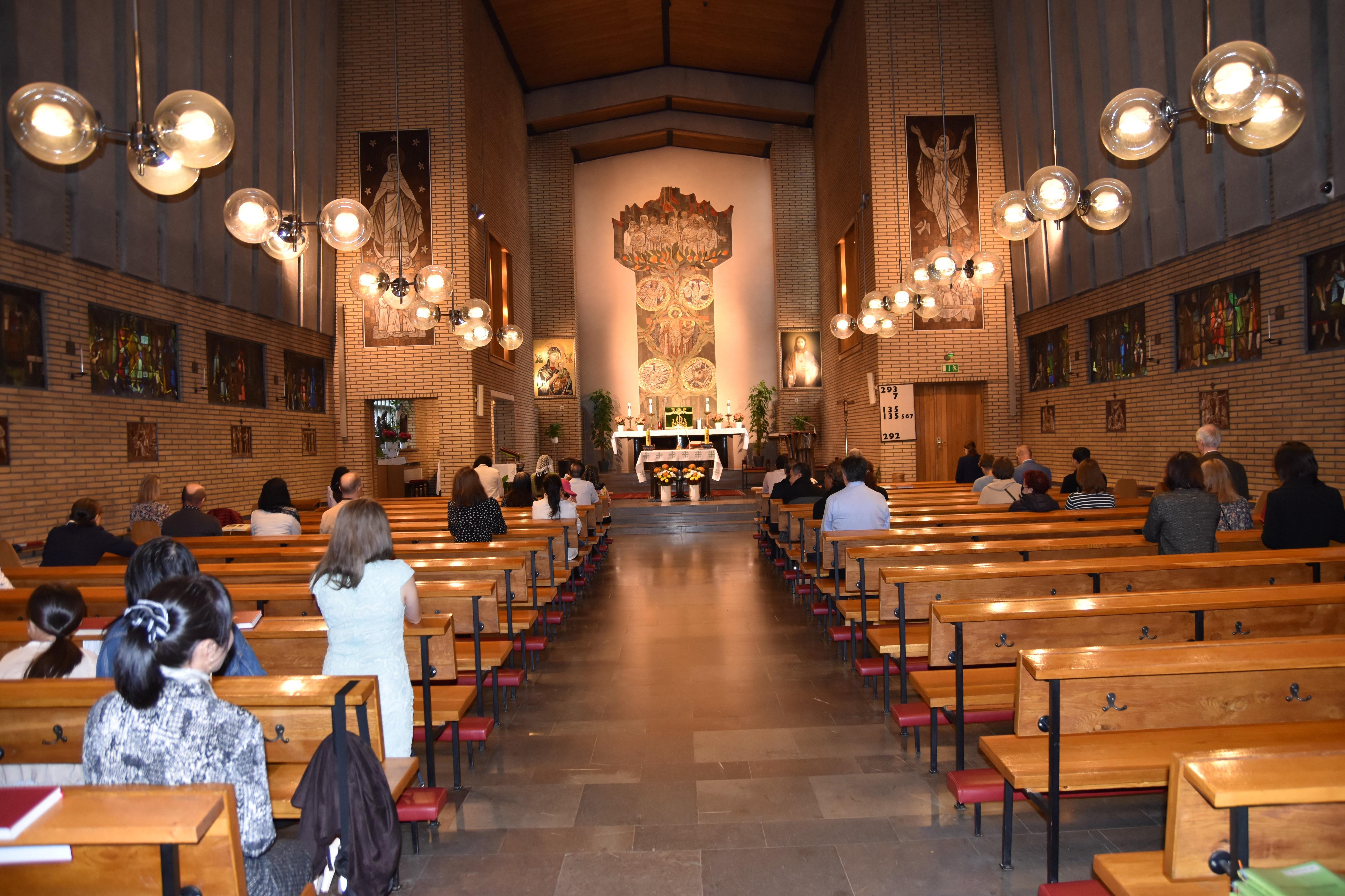 SV: St Maria katolska kyrkas interiör. På bilden syns bänkar, och i bakgrunden syns altaret.
