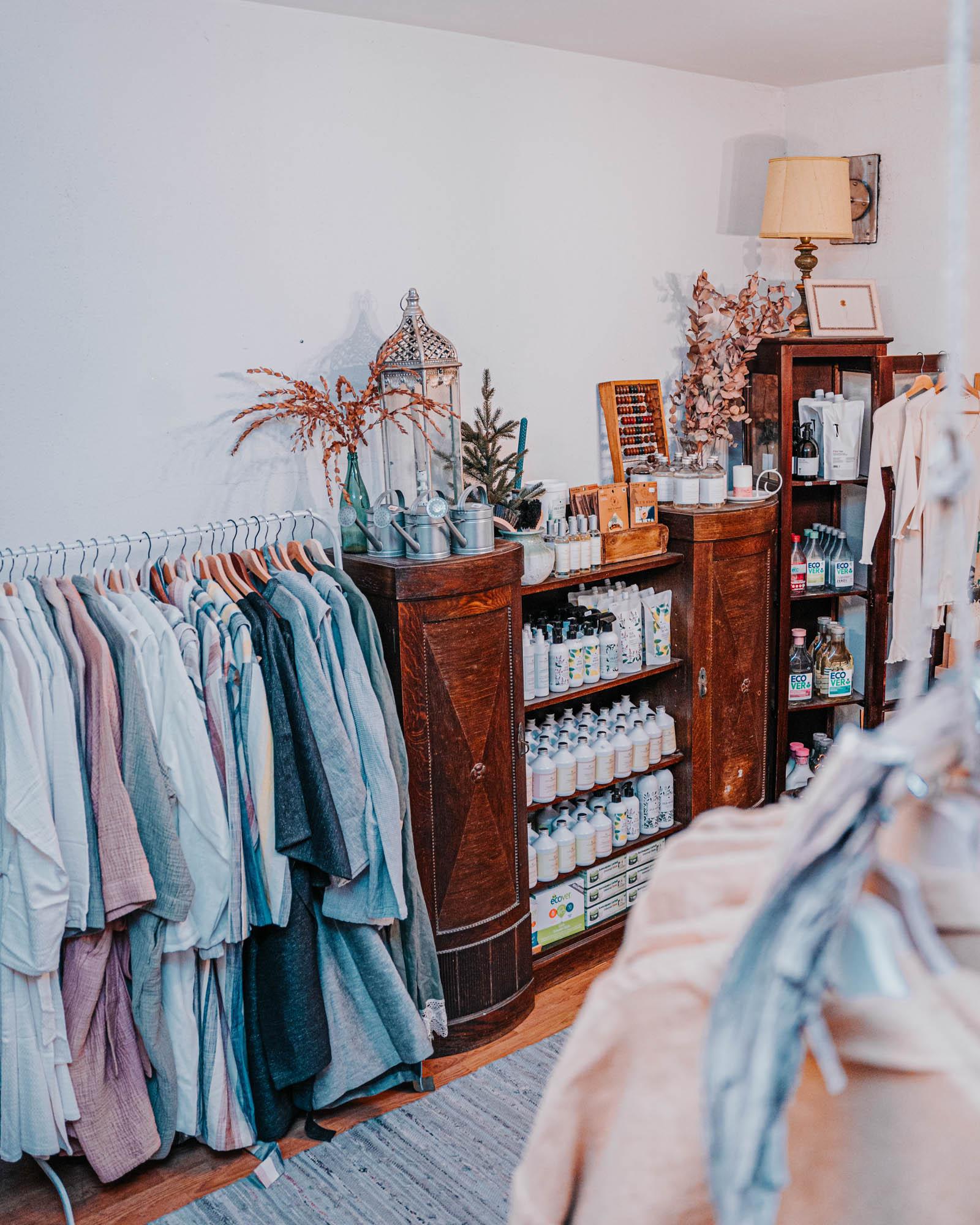 FI: Kaurilan Saunan tehtaanmyymälän tuotevalikoima, taustalla ikkuna.
