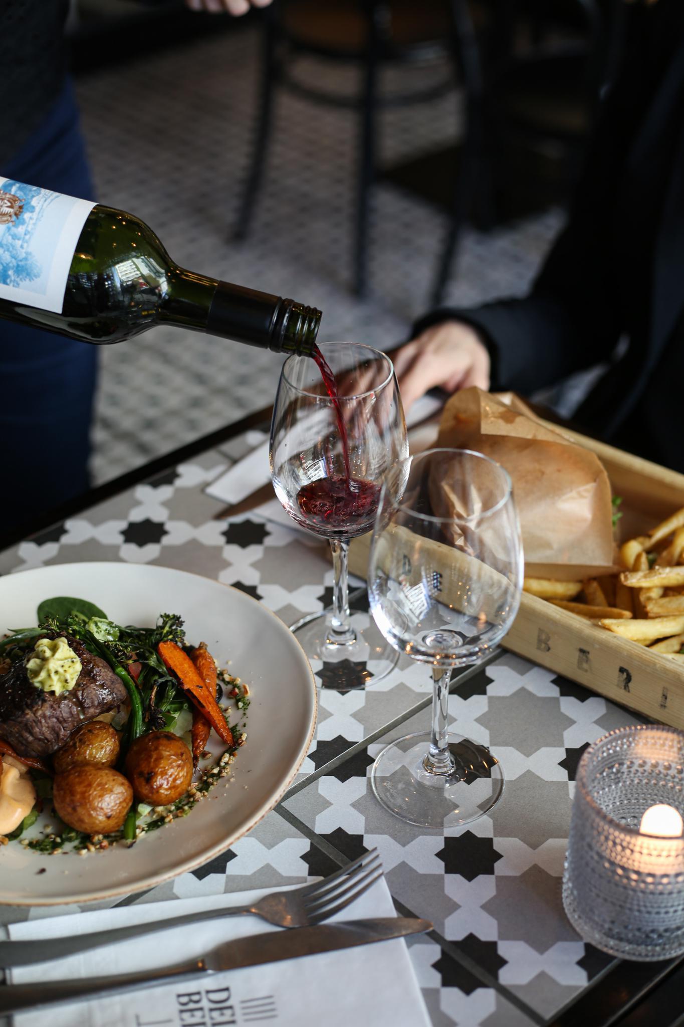 FI: Deliberi ruoka-annos ja viinilaseja pöydällä.