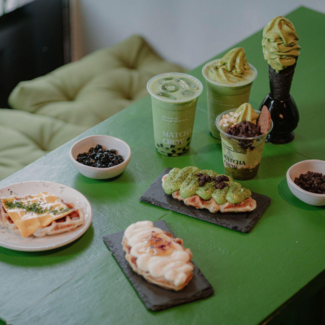 FI: Matcha Crewn juomia ja ruokia vihreällä pöydällä.