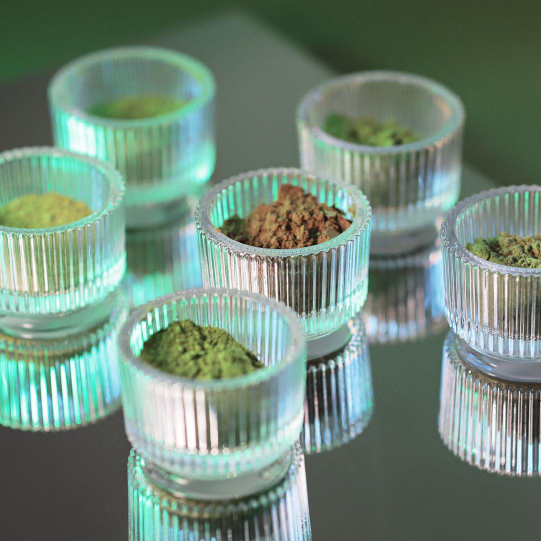 SV: Matcha Crews drycker och mat på ett grönt bord.