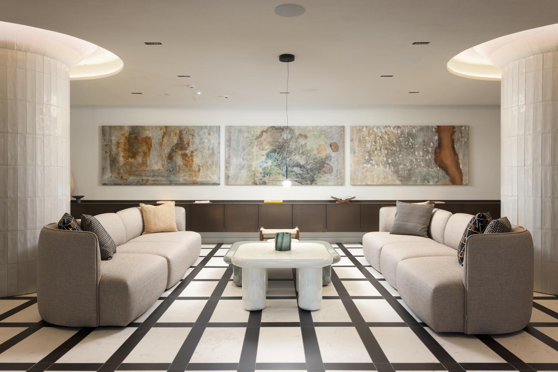 SV: Noli Katajanokka II interiör. Två soffor med ett bord i mitten.