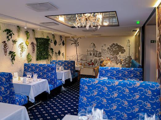 FI: Swad Indian Bistro & Barin sisätilat. Ravintolasali, jossa on siniset tuolit ja katetut pöydät.