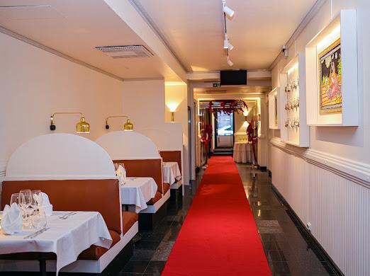 SV: Swad Indian Bistro & Bars inomhusutrymmen. Dukade bord, bredvid vilka finns en lång röd matta.