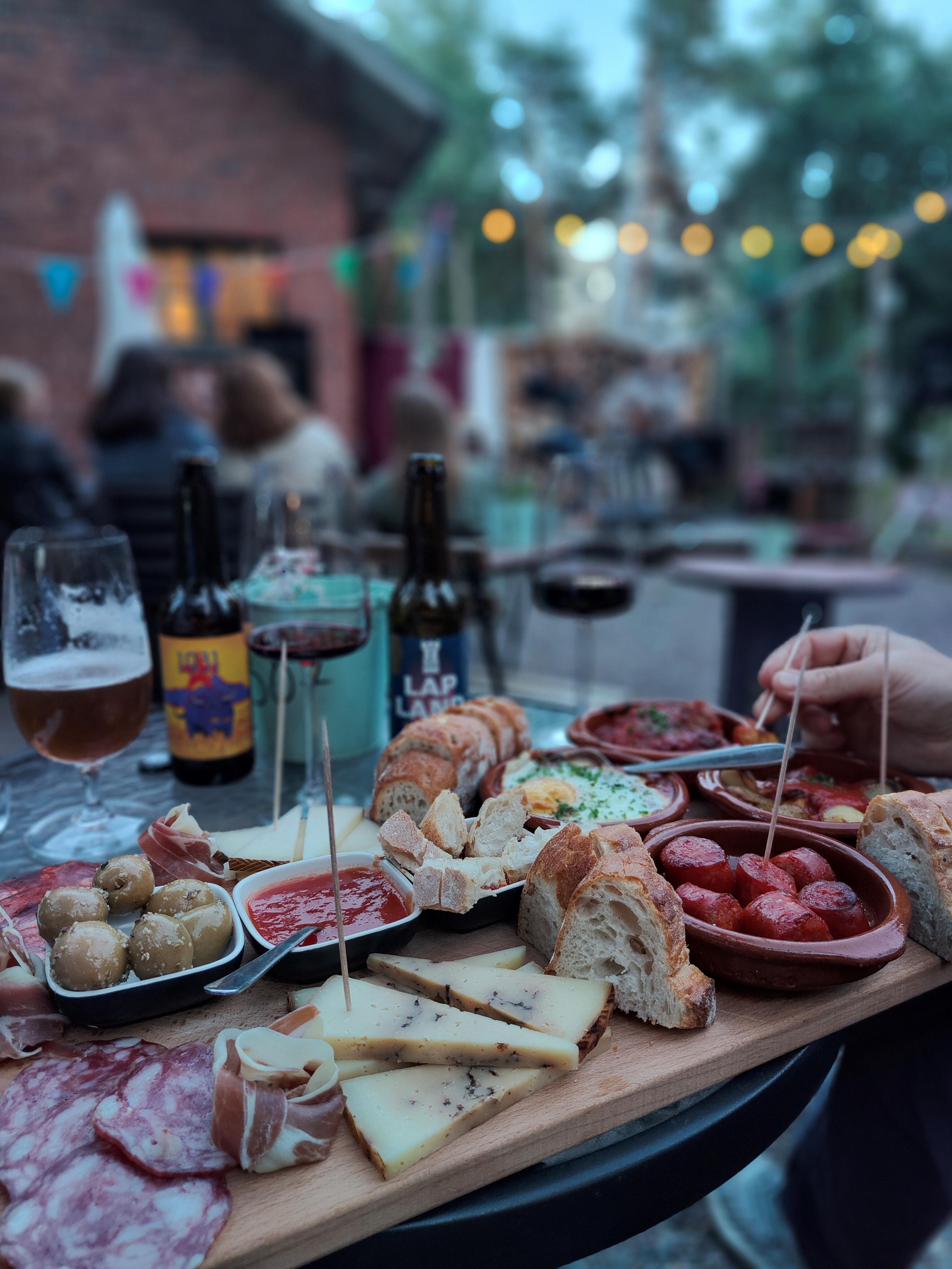 EN: Casa Haga's outdoor space. Tapas sortiment on the table, with people in the background sitting at a table.