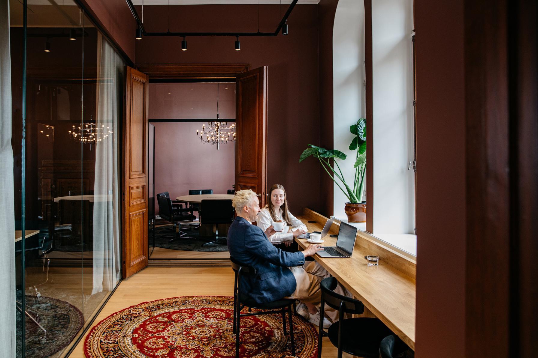 EN: VillageWorks Erottaja2 Business Lounge, where two people are sitting.