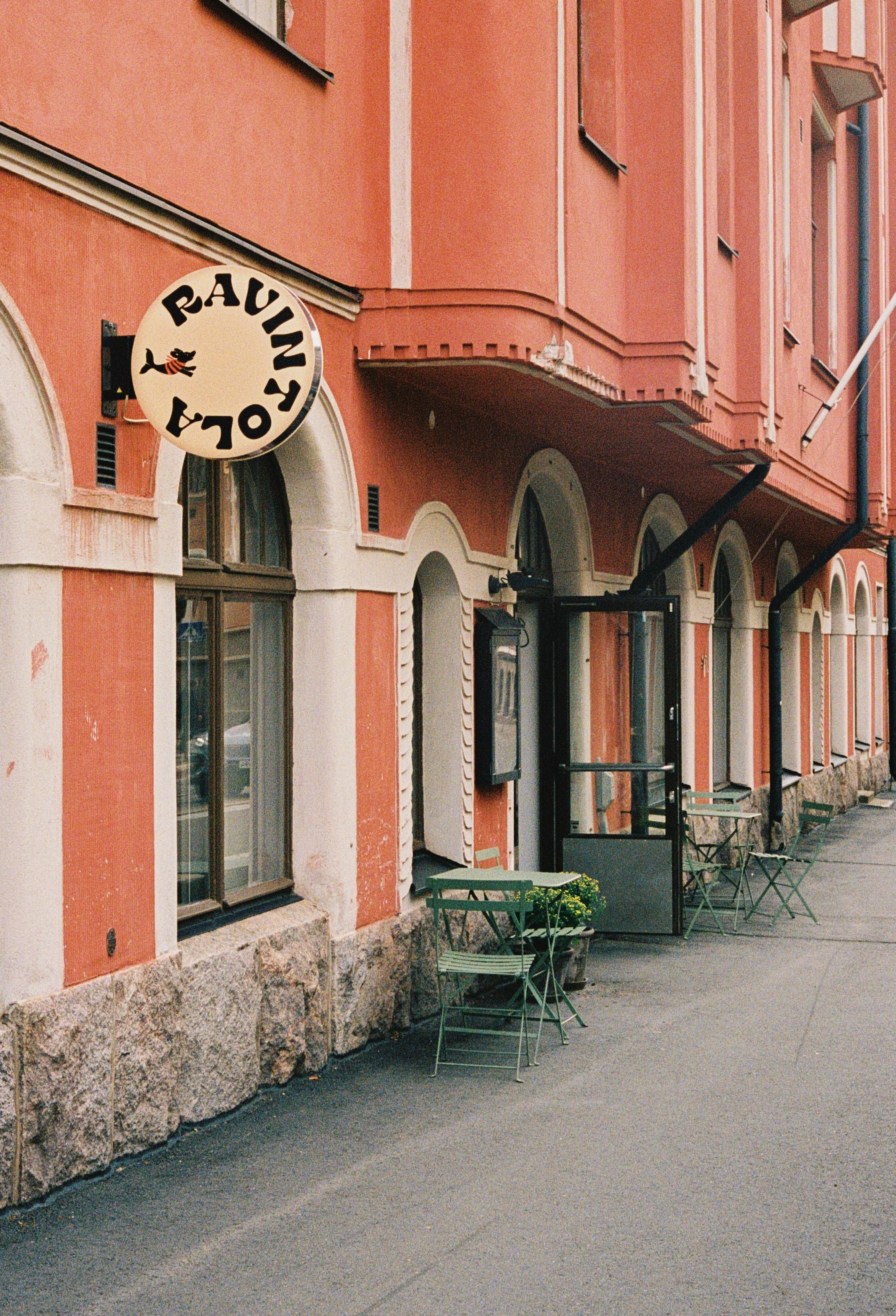 EN: Restaurant Laivakoira seen from the outside. A reddish building with the restaurant's sign and a small table in front of it.