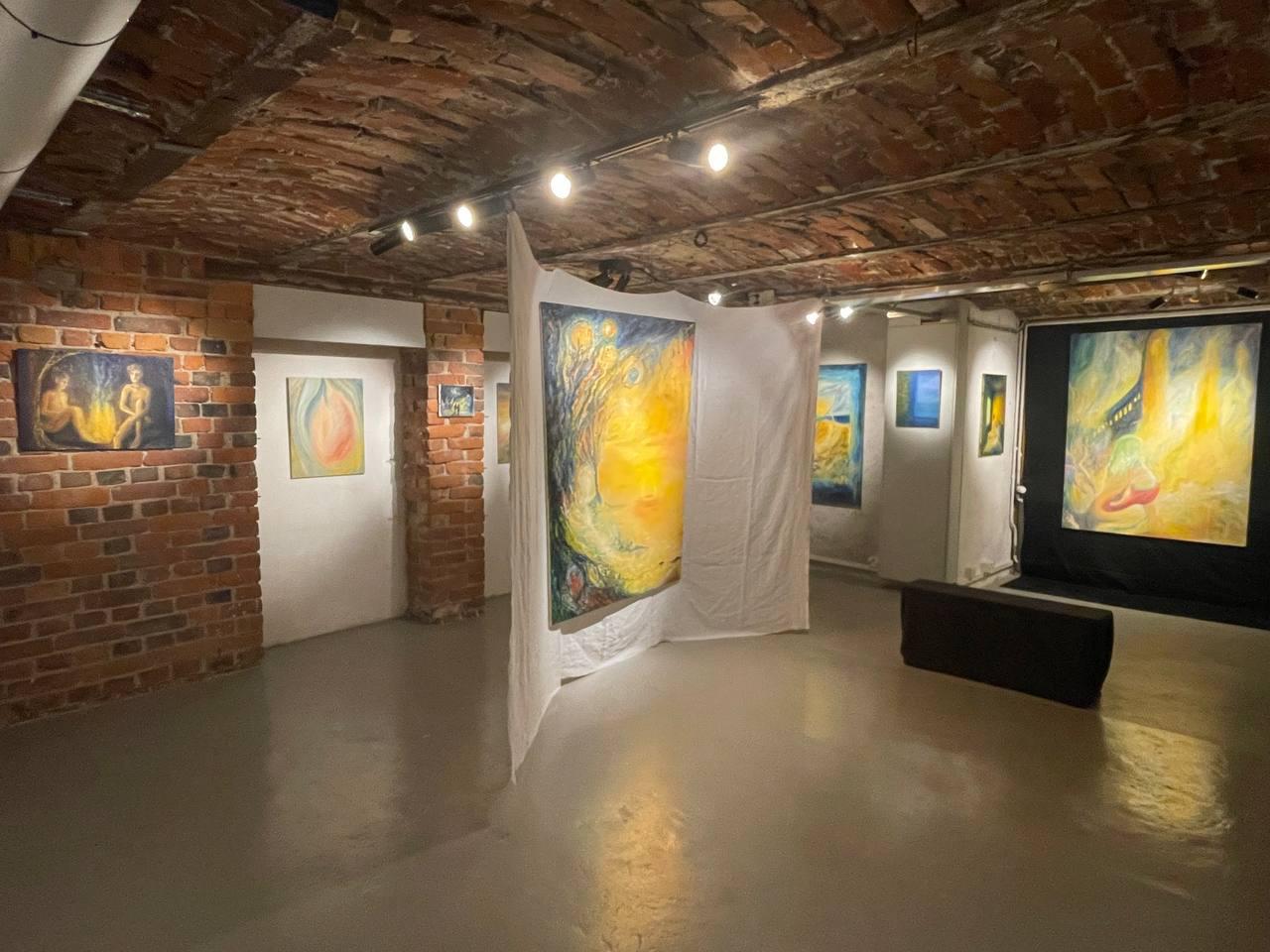 EN: Brick basement gallery space in the inner yard. Artworks can be seen on the walls.