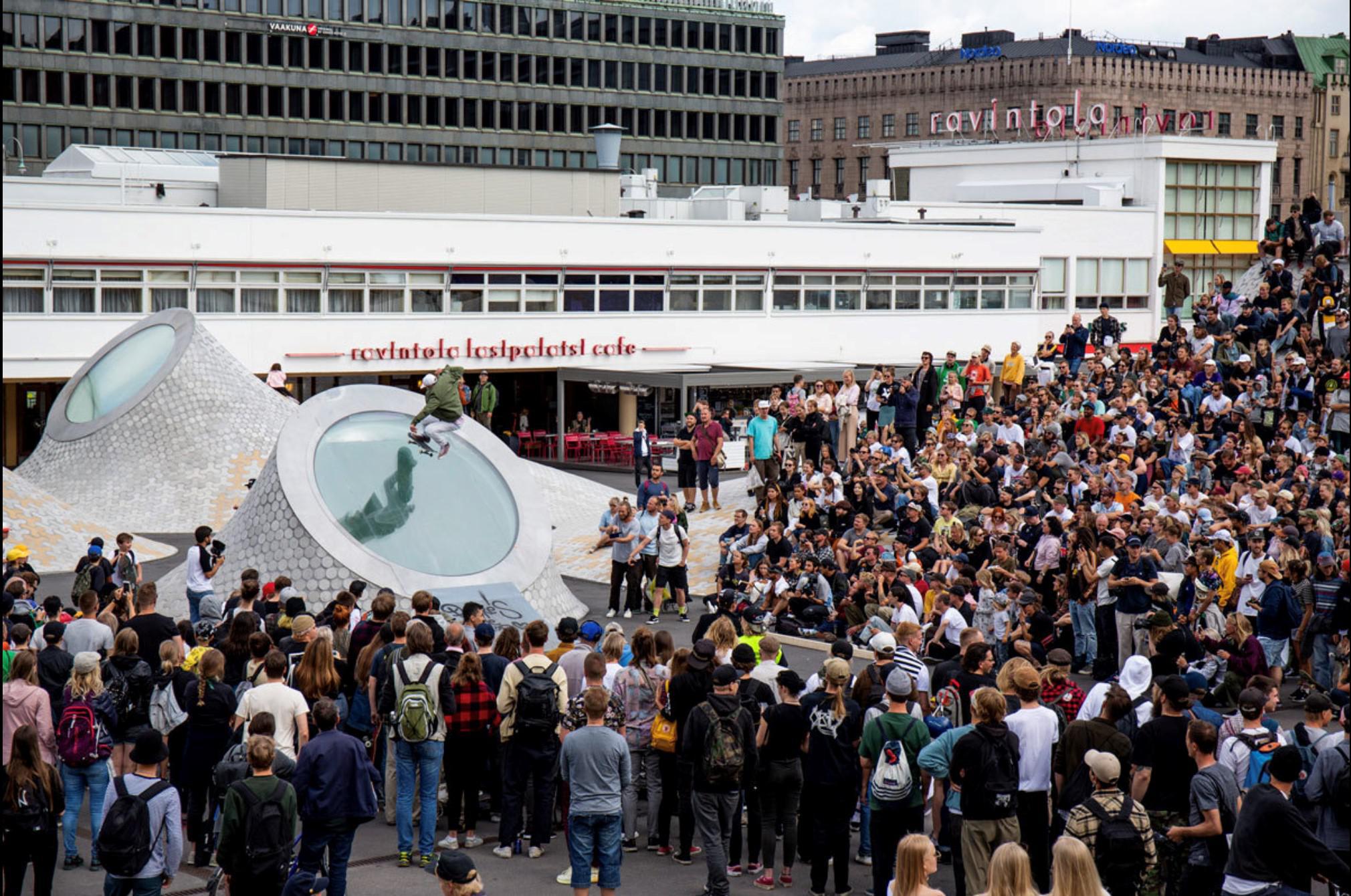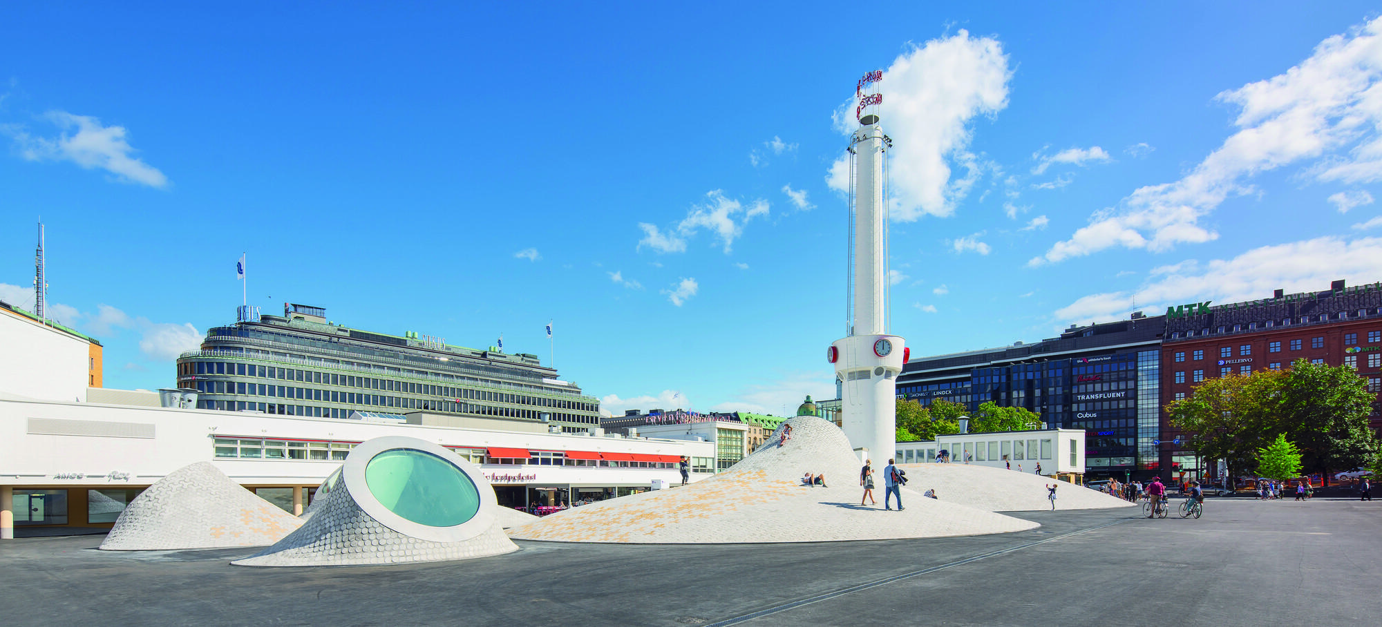 EN: The Lasipalatsi square ties together the activities of the whole block and serves as the heart of the city centre. A relaxing living room where people can hang out in the middle of the hustle and bustle of the city. An event scene adjacent to the Kulttuurikasarmi building enables both concerts and discussions. The square’s unique design is enhanced by five concrete-tiled mounds that offer a peek into the underground Amos Rex art museum. The pedestals of the bus platforms, which still dot the square’s edges, bear witness to its history.