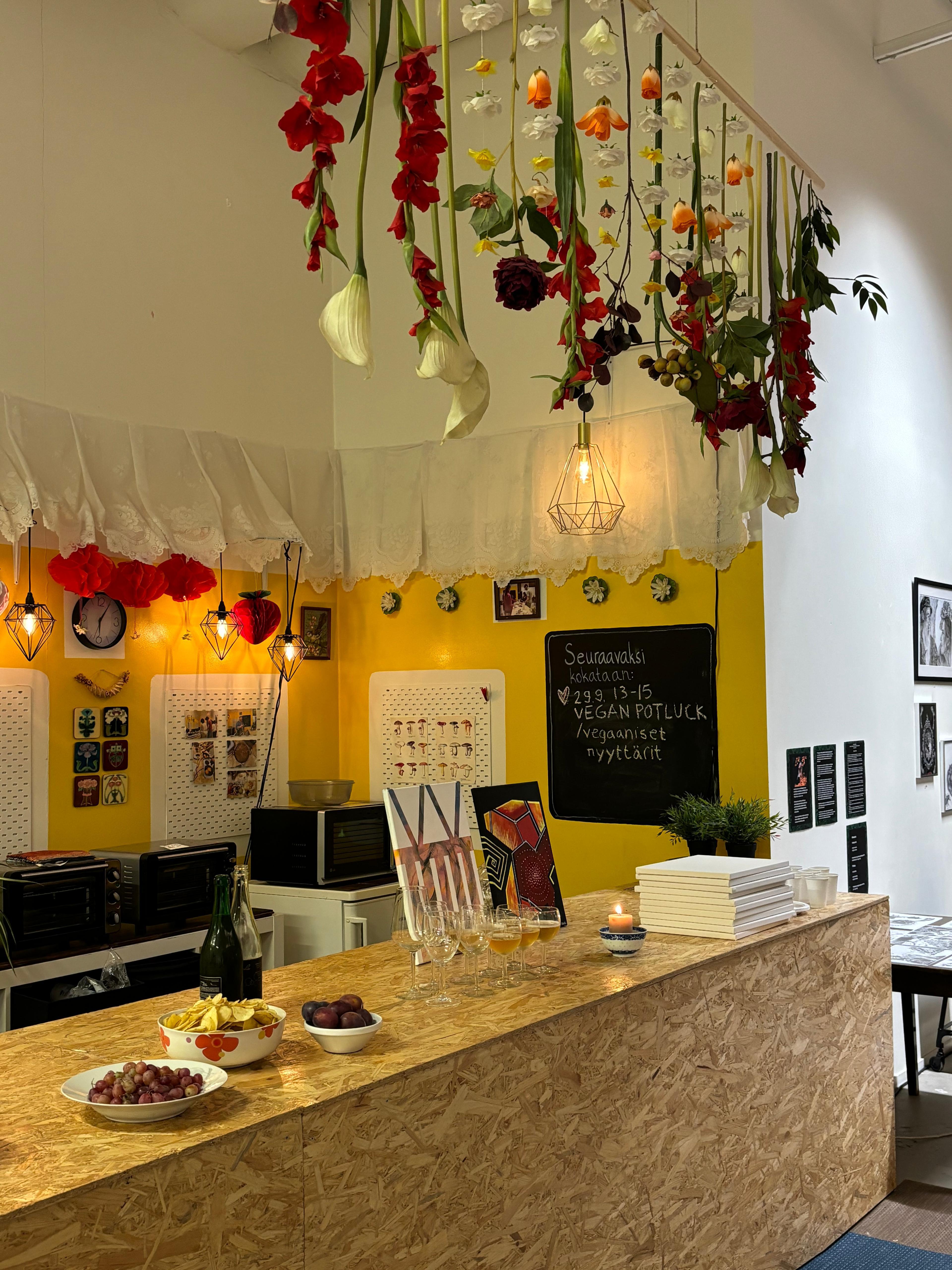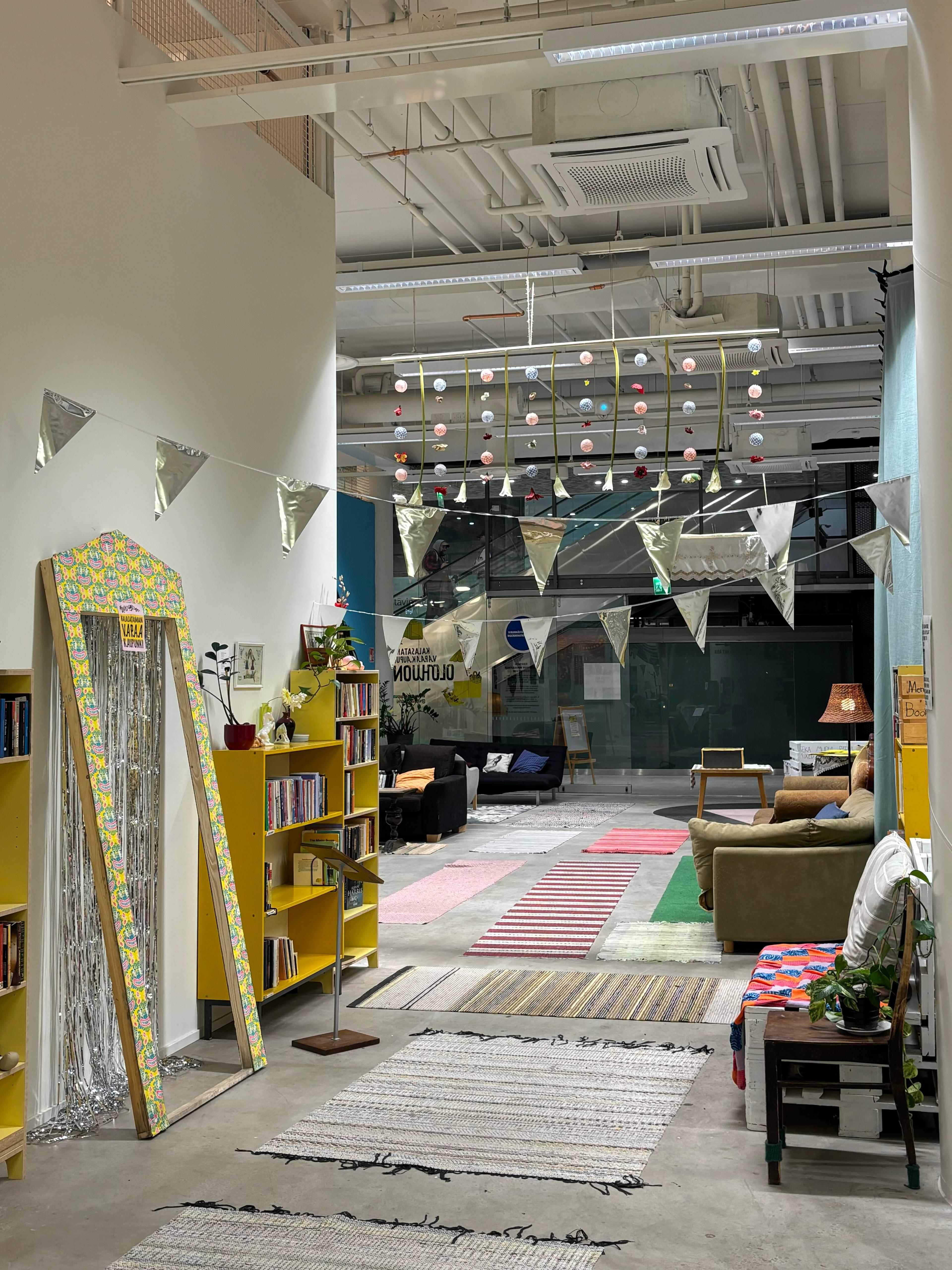EN: Kalasataman Vapaakaupungin Olohuone is a decorated living room located on the second floor of shopping center REDI in Kalasatama. The space is almost 450 square meters of size and 5 meters of height. The living room is sectioned into different spaces: for hanging out, quiet area for quiet hanging out or working and area for events and for making workshops. There are also changing exhibitions. The spaces are suitable for different types of activities such as workshops, hobby crafts, board gaming, co-working and yoga.