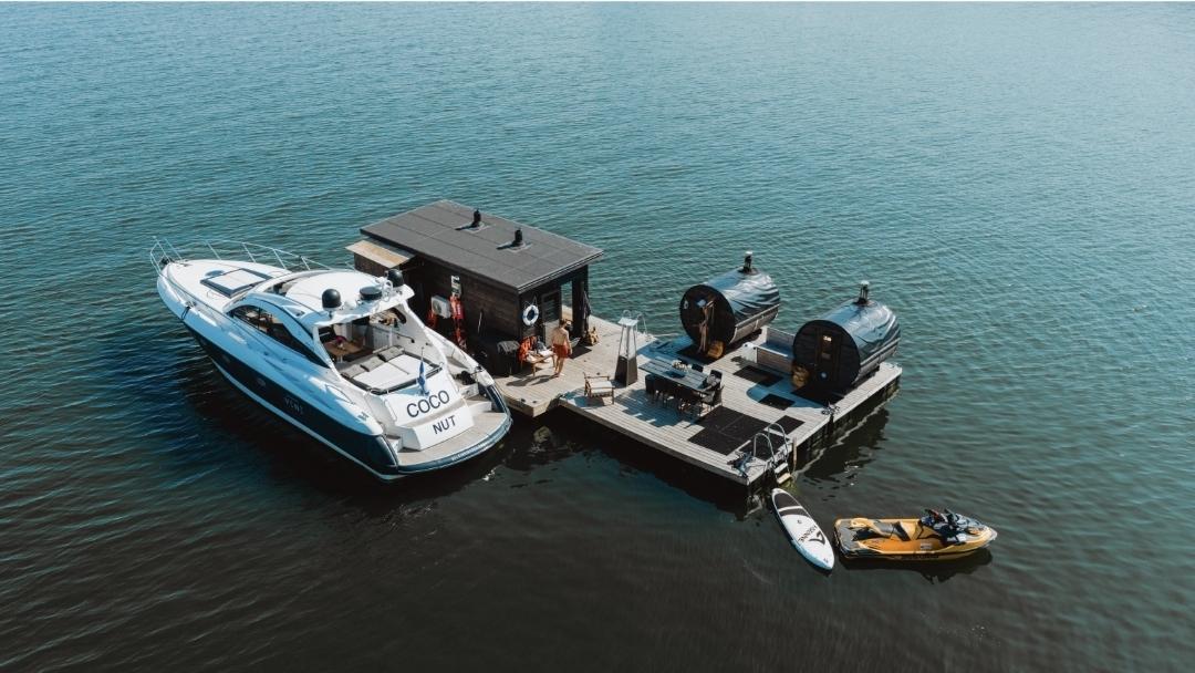 Lautalla on kaksi erillistä tilaa (oleskelutila sekä saunatilat), ruokailupöytä 8:lle, jääkaappi, iso blackbox kaasugrilli, wc, pukutila, saunatilat 6:lle, äänentoisto ja smart tv 65. Ulkona 360 astetta kiertävä iso terassi, jossa voi viettää aikaa ja rentoutua auringon alla. Saunalautan vieressä on kelluvaterassi lautta jossa ruokailee 8 ihmistä.