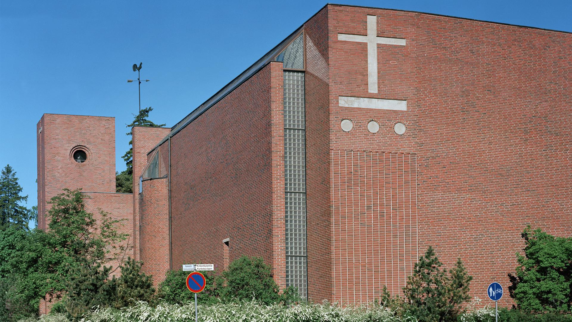 EN: Both the exterior and interior of the Malmi church are of red brick. The exterior wall of the church is decorated with brick ornamentation with a cross theme, like in medieval stone churches. The church, completed in 1981, was designed by architect Kristian Gullichsen. In compliance with the ancient method of church construction, the entrance to the inner court of the church is through the bell tower.