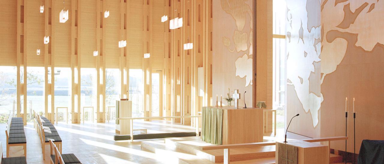 EN: The church is located in sustainable Eco-Viikki residental area and represents ecological wooden architecture. The exterior walls are made of split aspen shingles. In the interior, there is a forest of pillars made of glulam cluster columns. The altarpiece, Elämän puu (Tree of life), and the works in the baptism recess and on the foyer wall are mahogany patterned with punched silver. Their motif is the vine parable of Jesus. The church was designed by architect Samuli Miettinen from JKMM. The altarpiece, the crucifix and the works in the baptism recess and foyer are by artist Antti Tanttu. The church textiles were designed by textile artist Hanna Korvela.