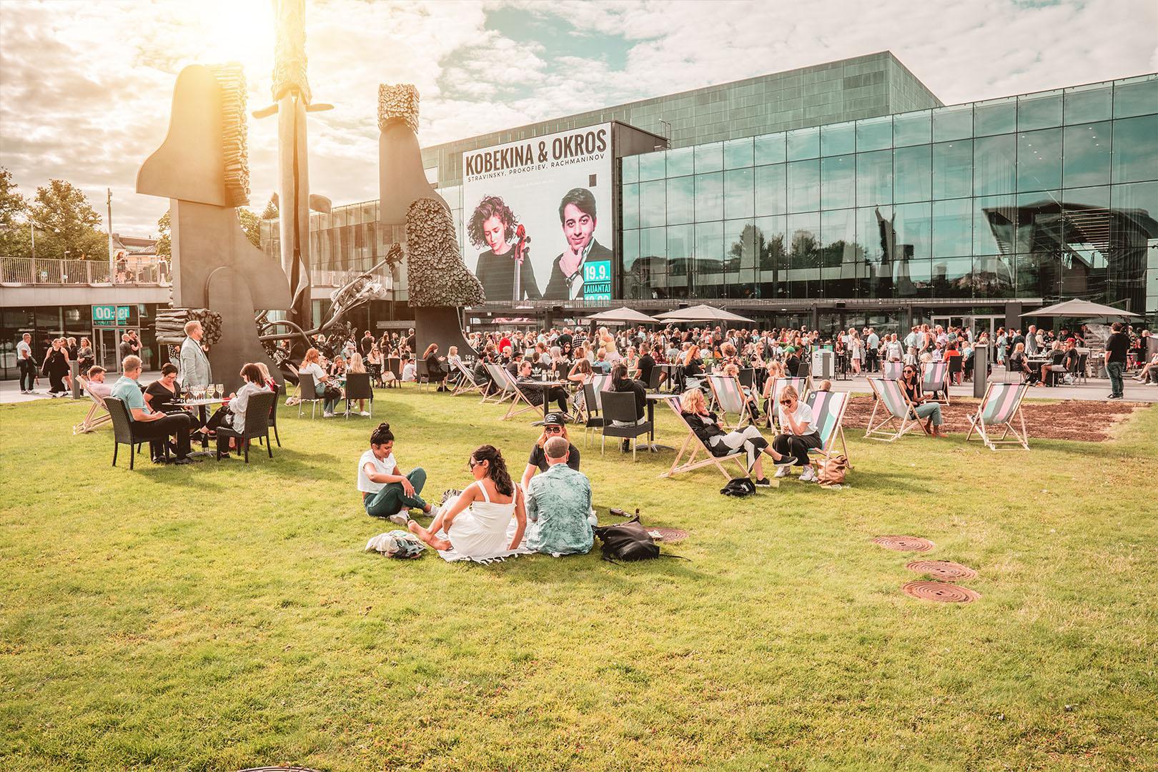 FI: Musiikkitalo, näkymä ulkoapäin. Ihmisiä istumassa nurmikolla rakennuksen ulkopuolella.