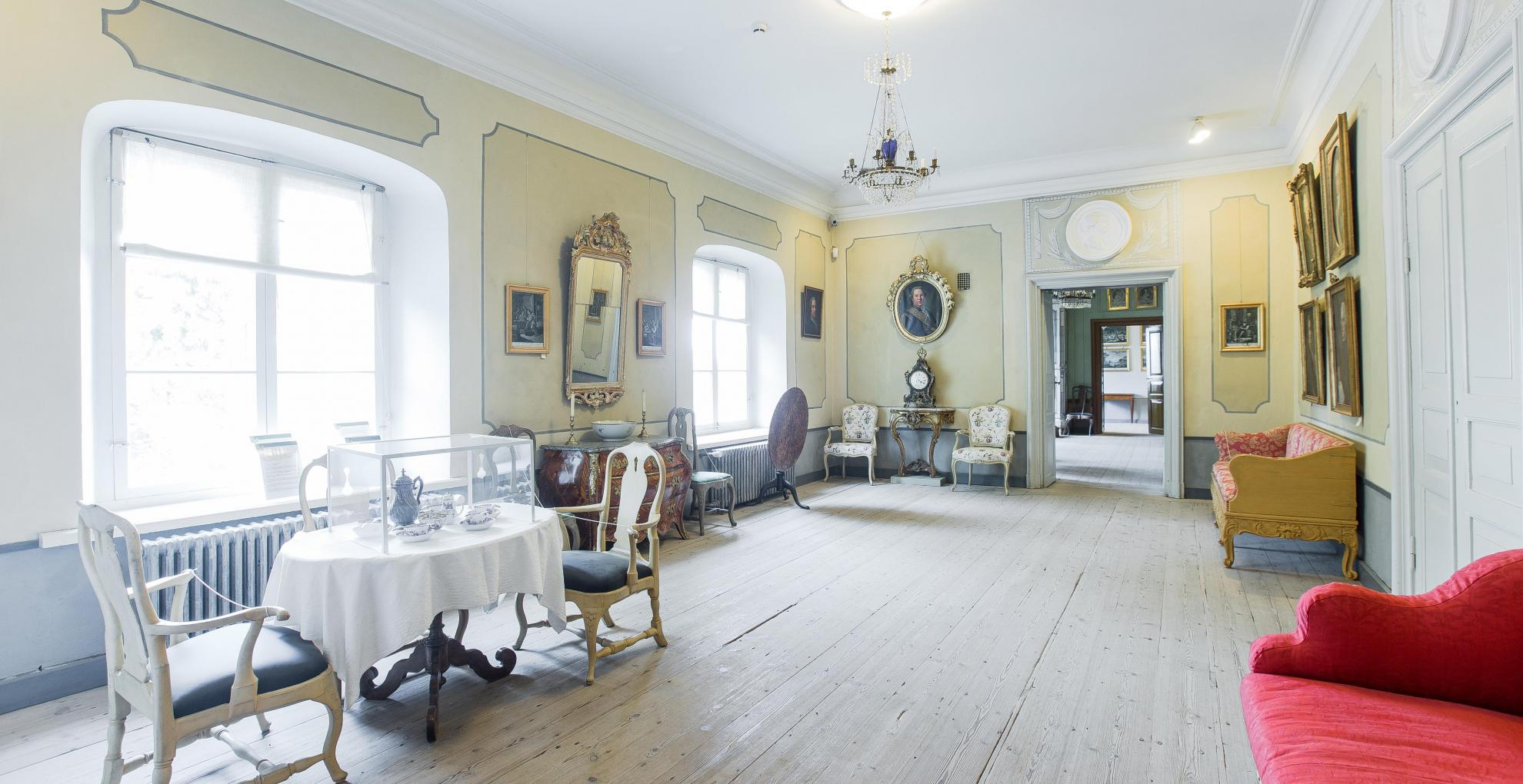 SV: En interiörbild från en sal i museet med möbler och målningar i 1700-talsstil.
