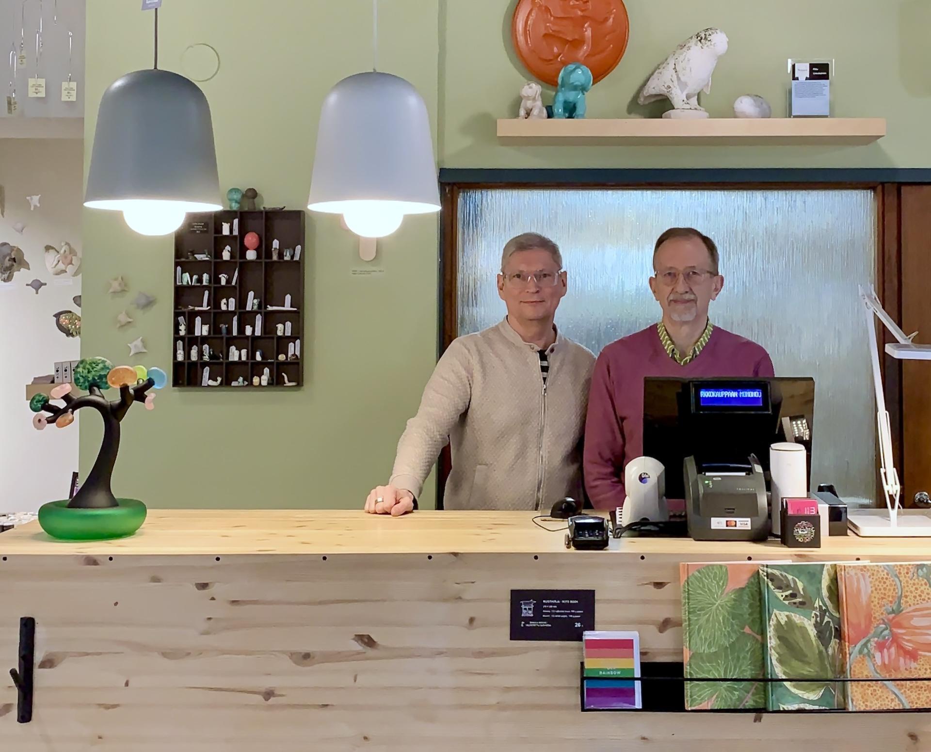 FI: Kaksi henkilöä seisoo tiskin takana. Tiskin yläpuolella on kaksi valaisinta.