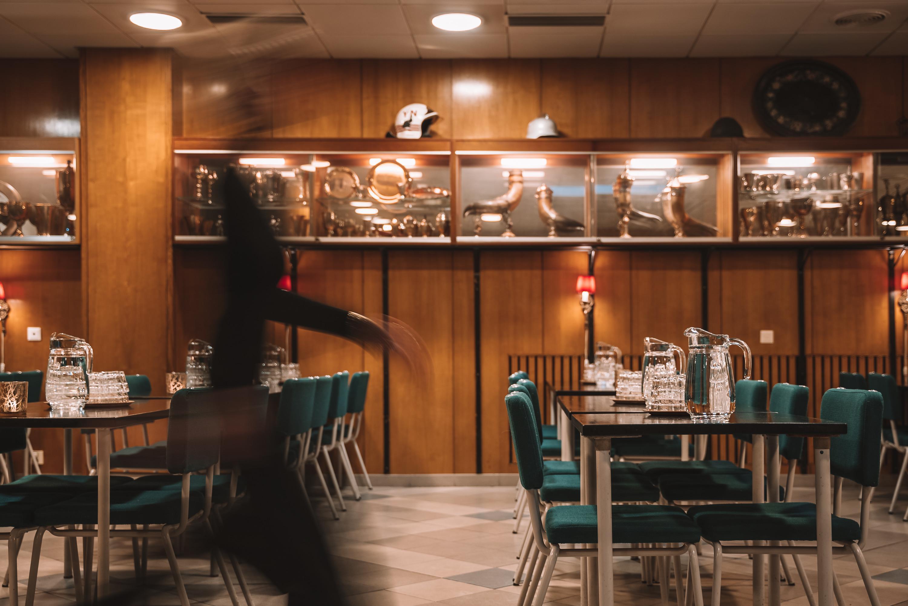 SV: Pompier Albertinkatus interiör. Restaurangsal med dukade bord.
