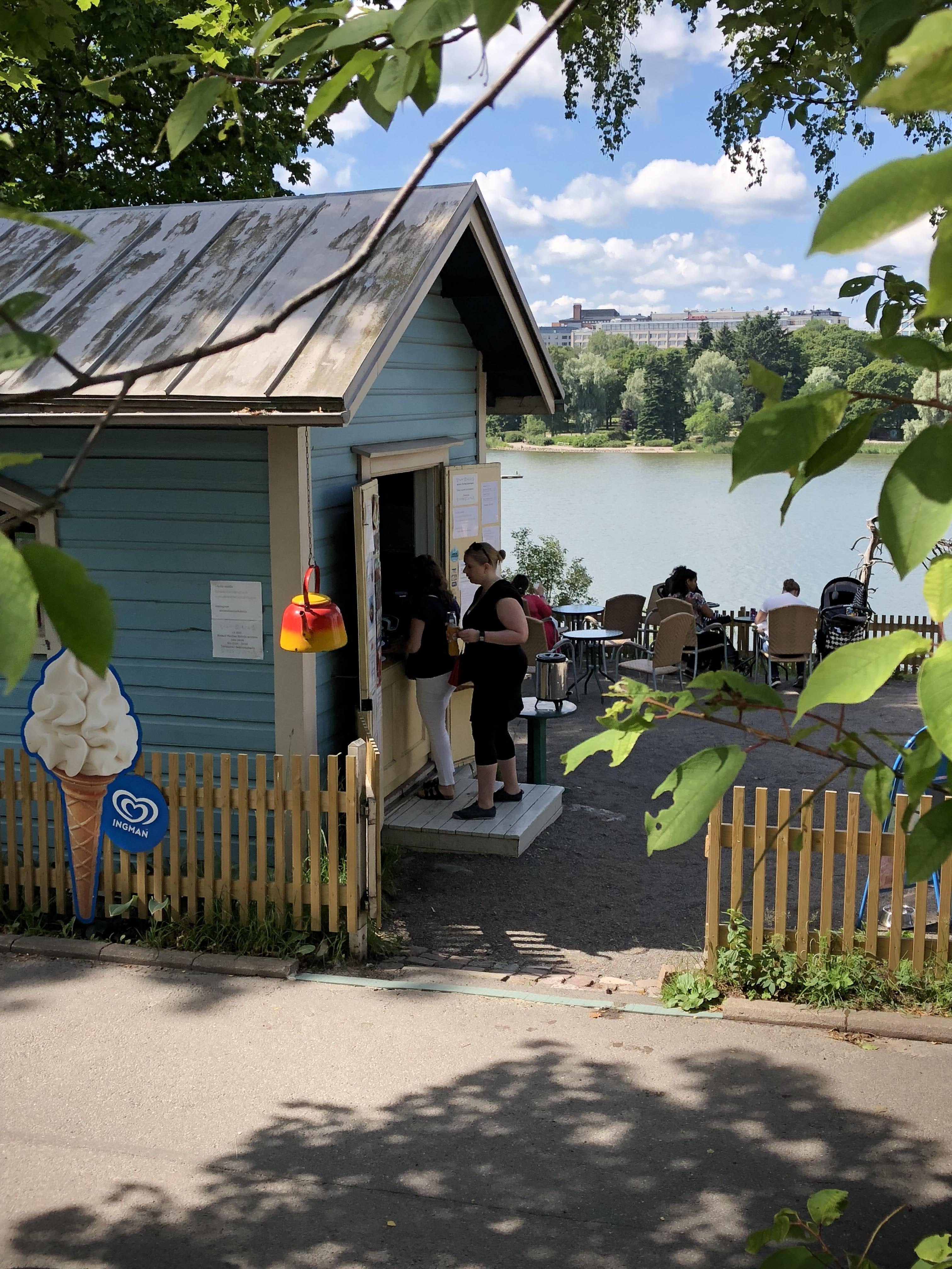EN: A summer outdoor cafe at the beautiful Linnunlaulu villa area at Töölönlahti bay. The cafe is located in the garden of a blue villa (hence the name Sininen Huvila, Finnish for blue villa) built in 1896.