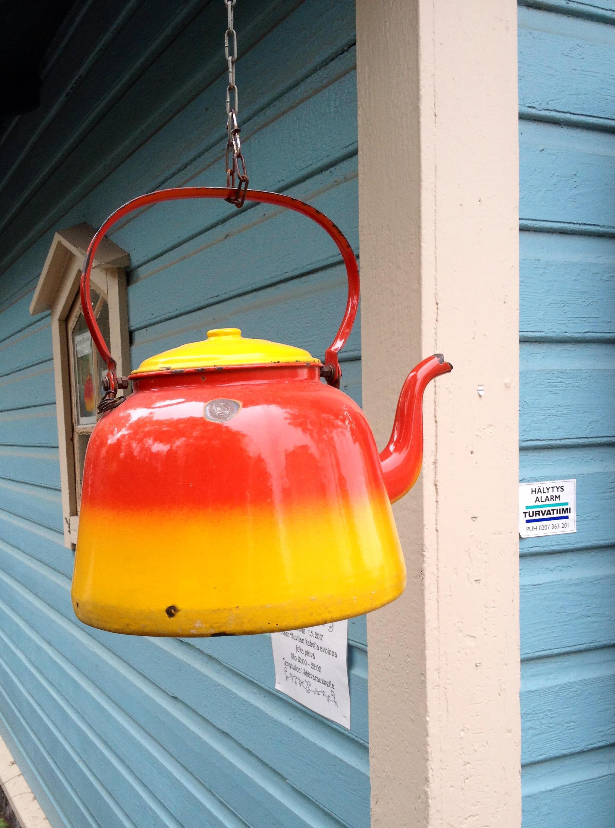 FI: Kahvilan kuuluisa iso punainen kahvipannu, taustalla näkyy sininen kahvilarakennus.