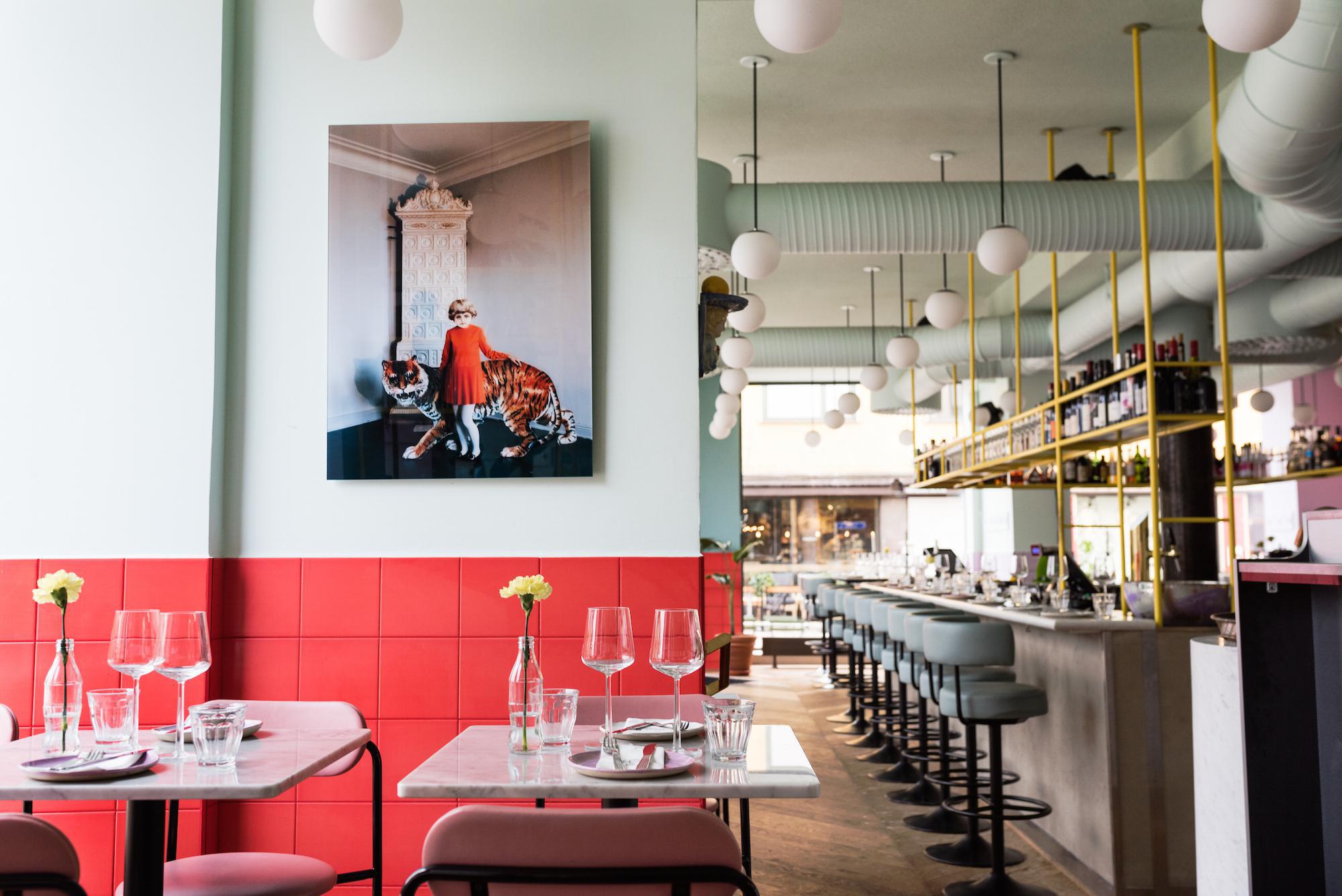 SV: The interior of YesYesYes. A picture is hanging on the wall, and in front of it tables.