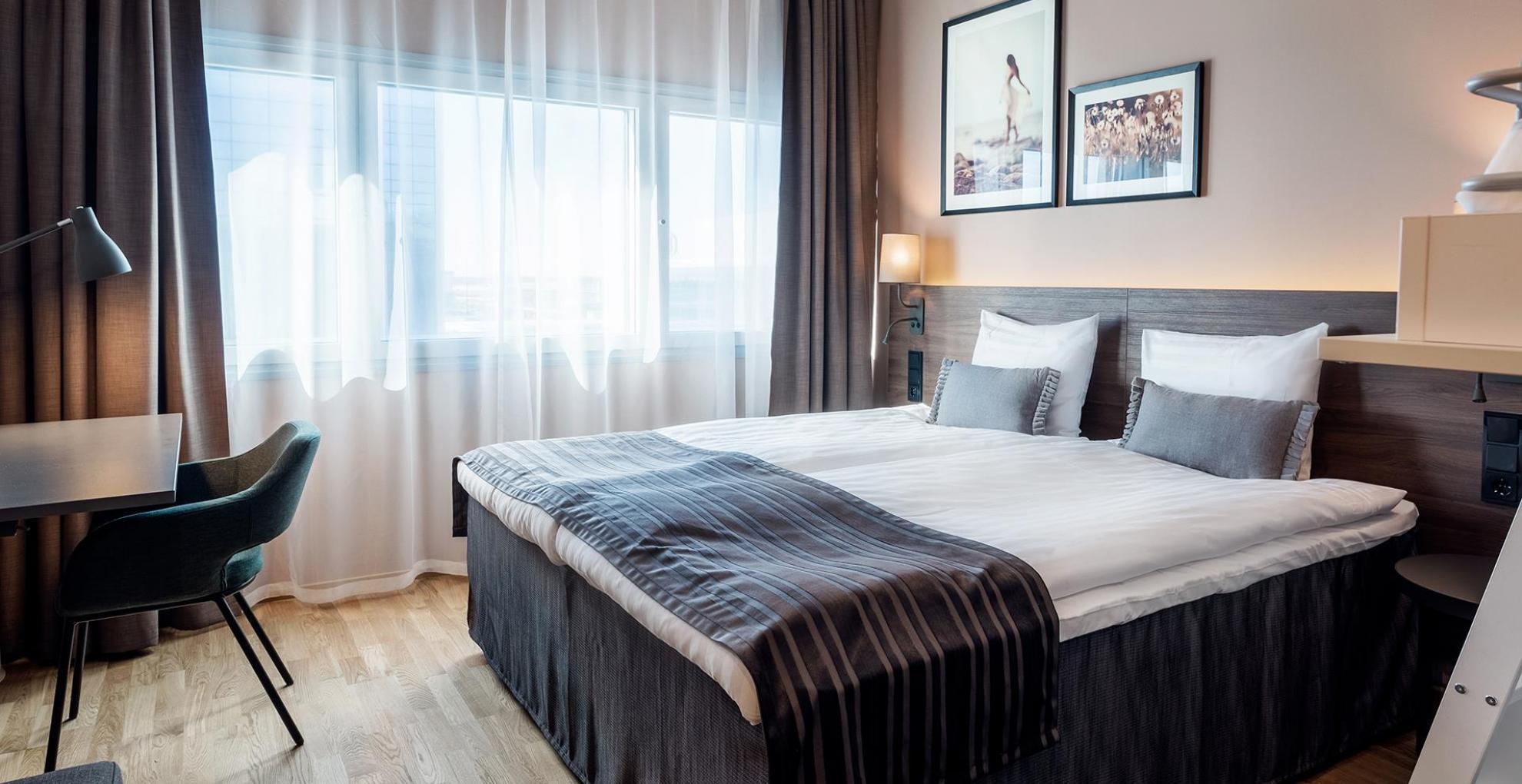 FI: Scandic Helsinki Airportin hotellihuone. Kuvassa sänky, ikkuna valkoisilla verhoilla ja seinällä tauluja.