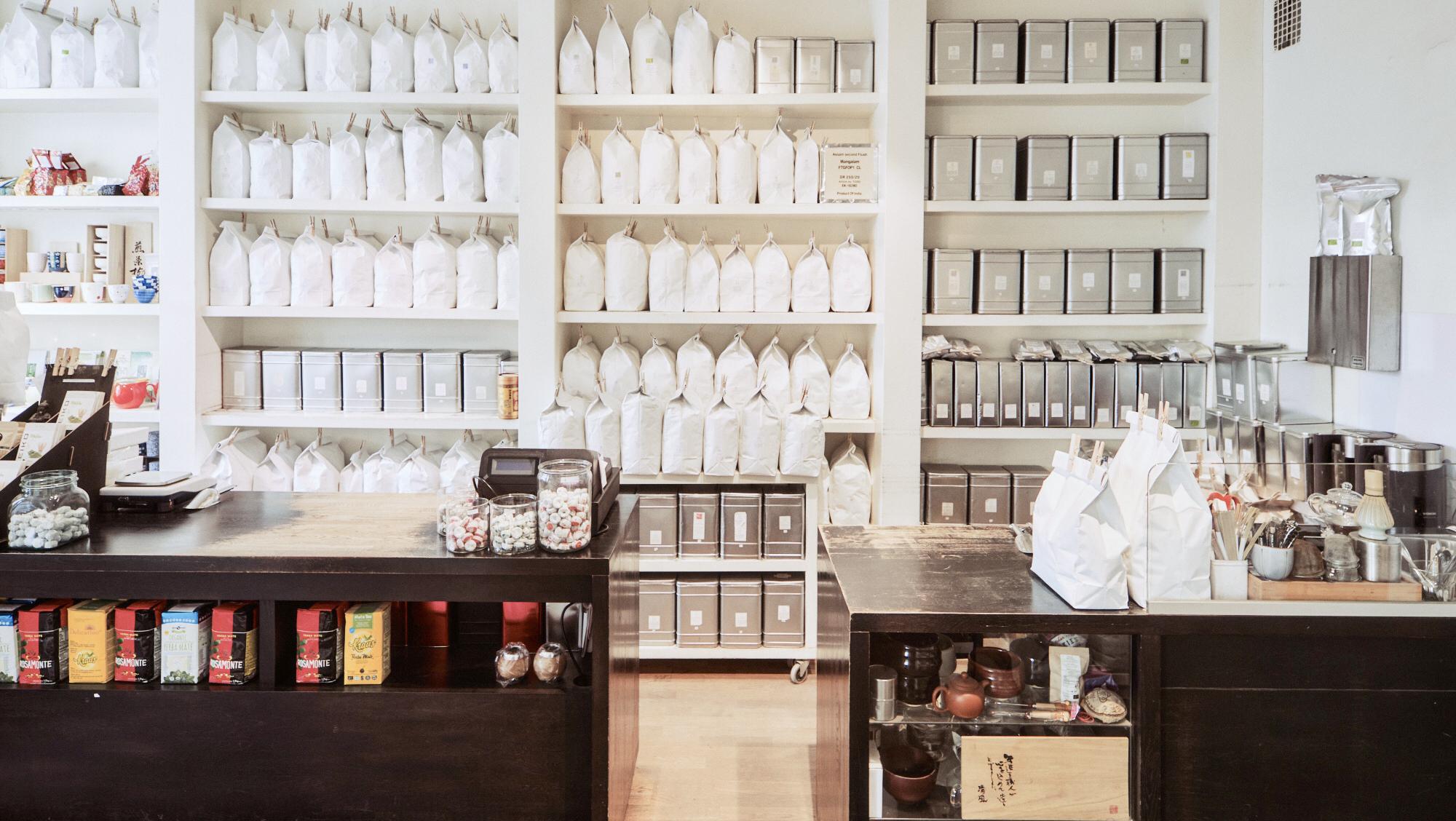 FI: Théhuoneen sisätilat. Hyllyissä on useita teelaatuja, ja hyllyjen edessä on tummat pöydät.