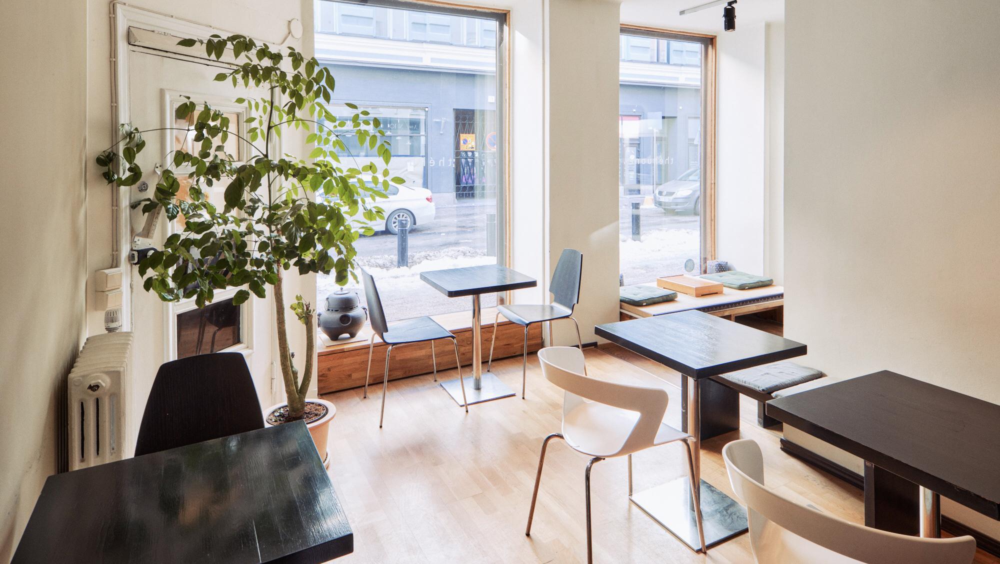 FI: Théhuoneen sisätilat. Teehuoneessa on pöytiä, huonekasvi ja ikkunat kadulle päin.