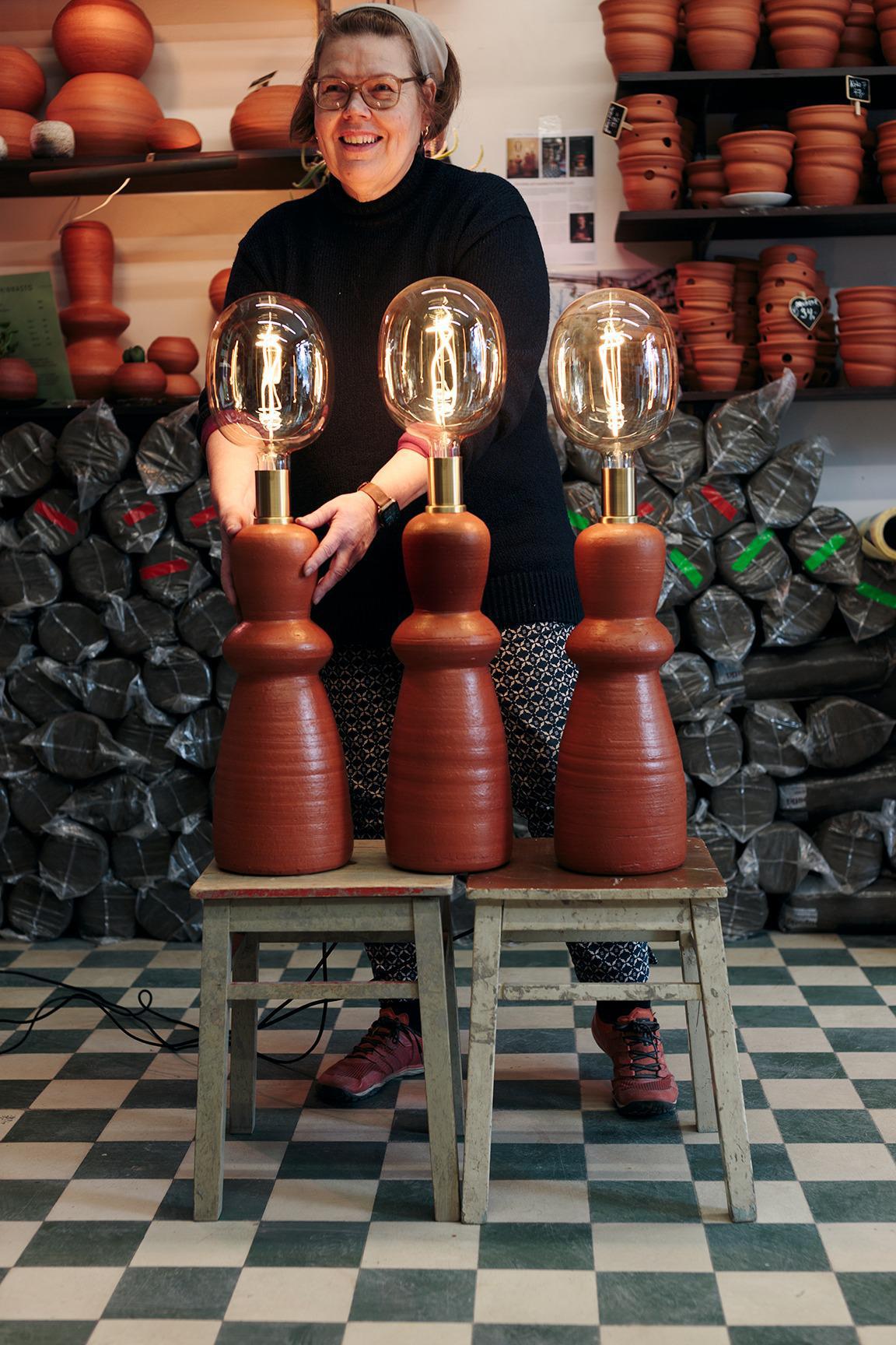 SV: Handgjord lyx, keramik av lokal naturlera. Lampor och blomkrukor gjorda med ett nordiskt grepp.