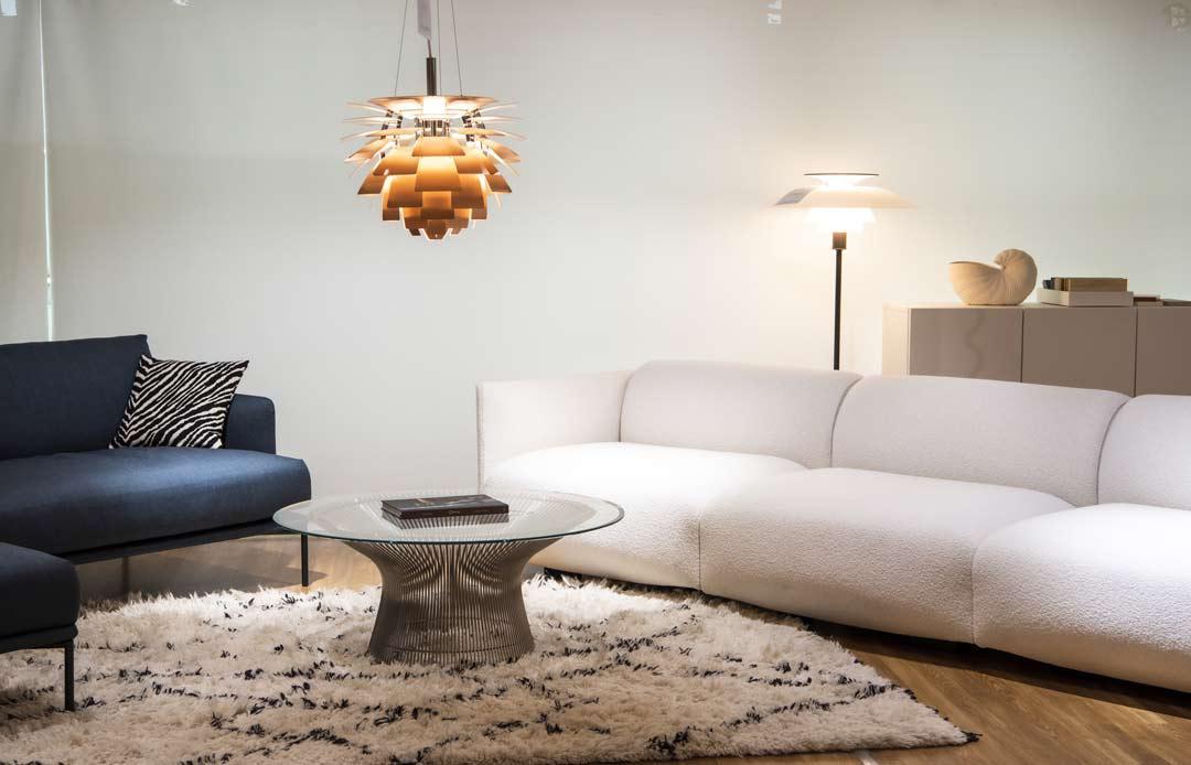 EN: A modern living room corner with a white sofa, glass table, and iconic pendant light at Vepsäläinen's Annankatu store.