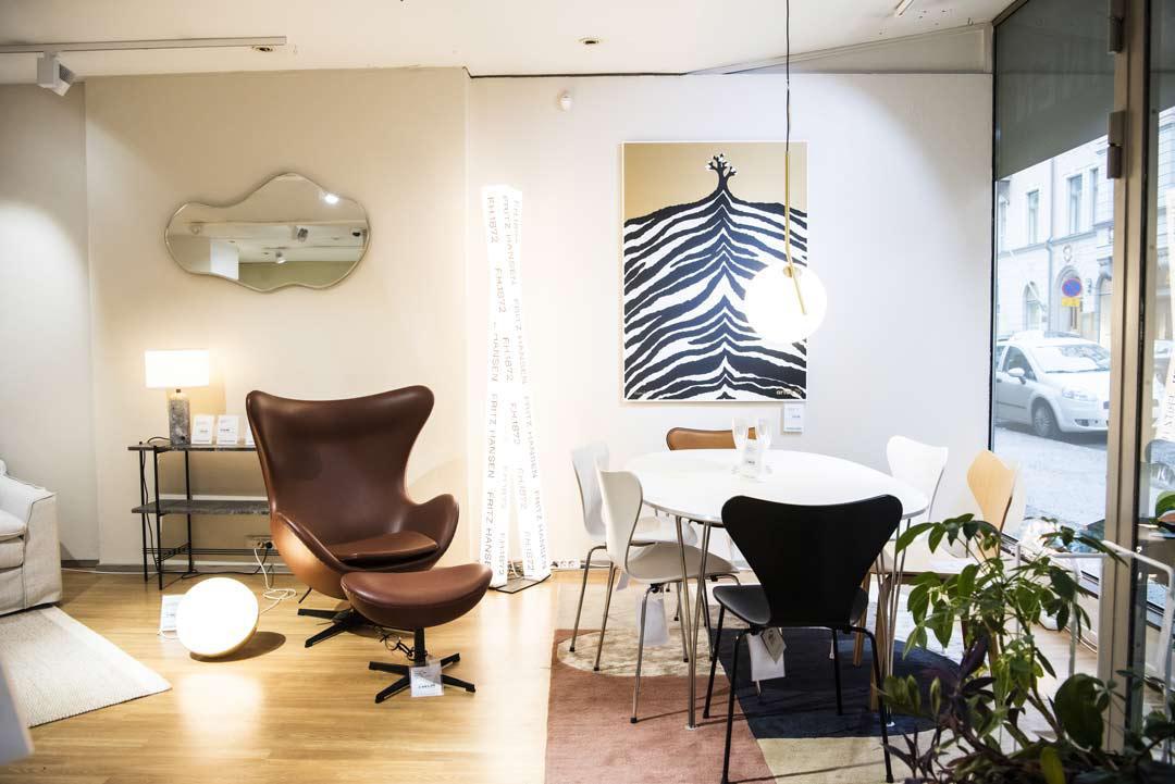 FI: Design-tuoleja sisältävä sisustusnurkkaus Vepsäläisen Annankadun myymälässä, jossa näkyy ikoninen ruskea nojatuoli.