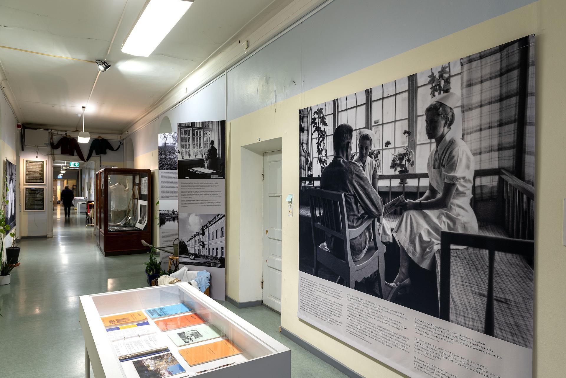 EN: The photo shows museum info panels in the corridor of the old hospital in Lapinlahti.