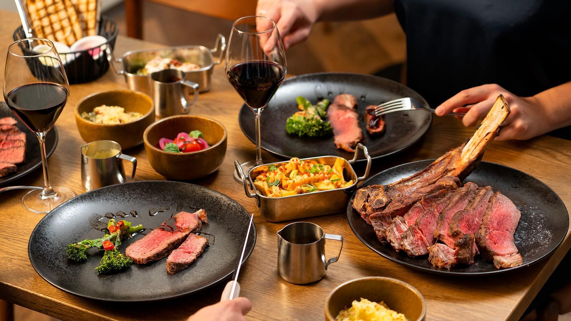 FI: Grill it! Tapiola Garden. Kuvassa pöytä, jonka päällä on ruoka-annoksia ja juomia.