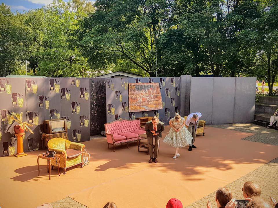 FI: Näyttelijät kumartavat aurinkoisella ulkonäyttämöllä.