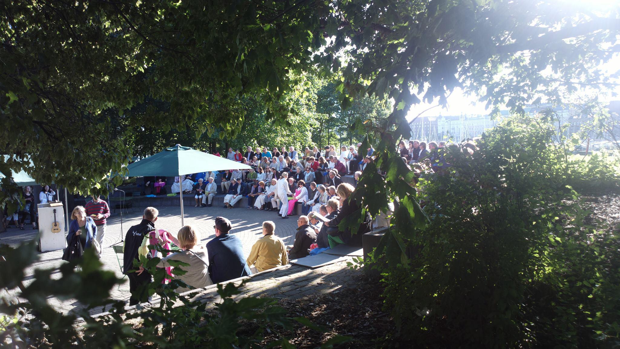 FI: Amfitea!erin katsomo, jossa näkyy ympäröivien puiden lomasta paljon yleisöä. Taustalla näkyy purjeveneiden mastoja.