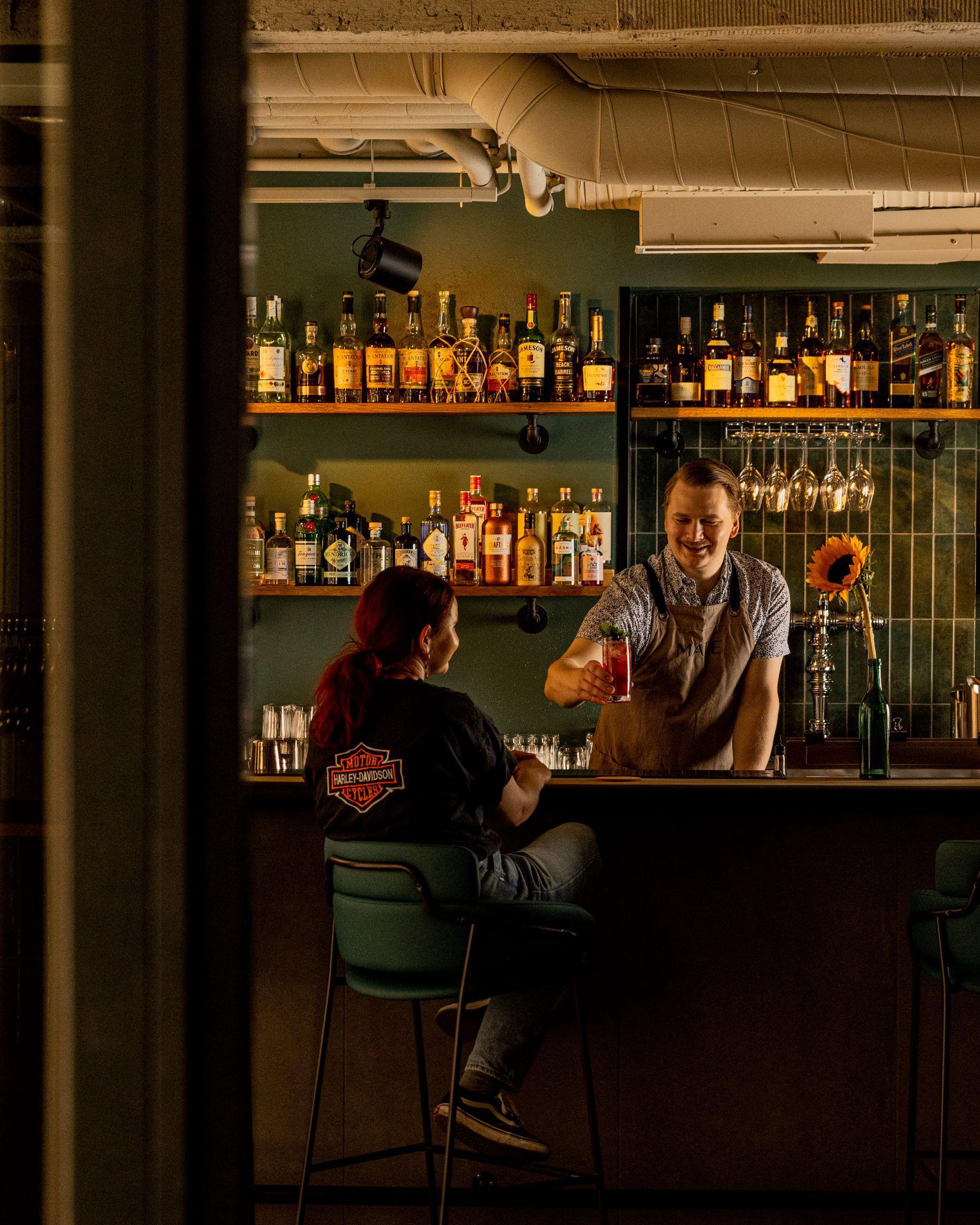 FI: Bar Maten sisätilat, kaksi henkilöä baaritiskillä.