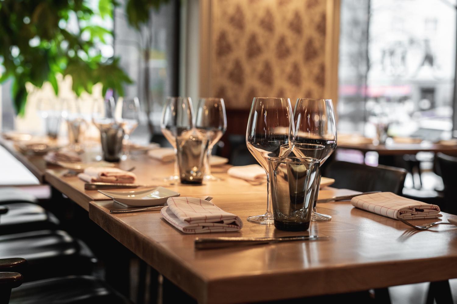 SV: Restaurang Kuus interiör. På borden finns glas och bestick, och i bakgrunden syns en inomhusplanta.