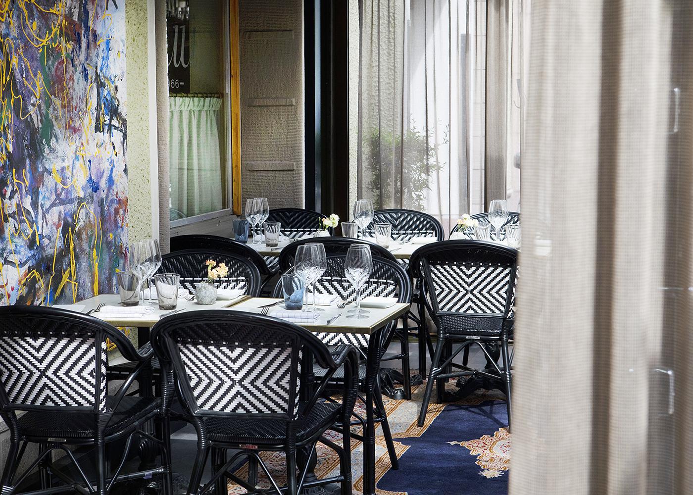 SV: Restaurang Kuus interiör. Dukade bord, och på vänstra sidan syns en målning på väggen.