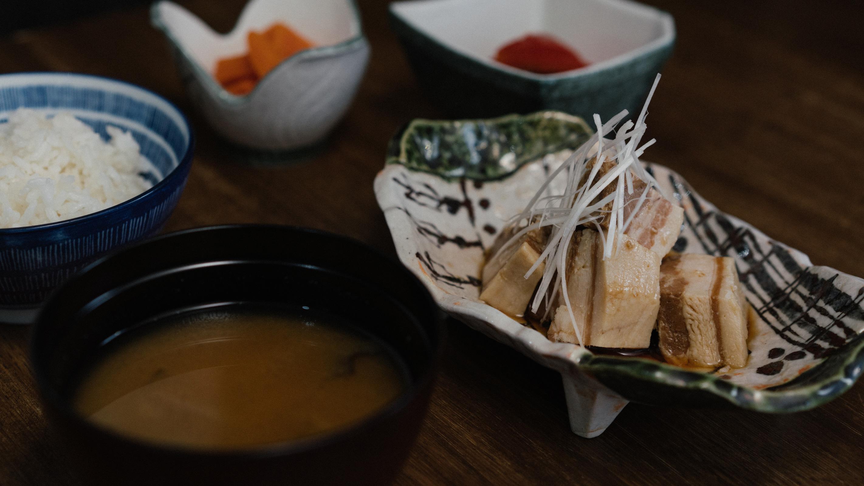 SV: Izakaya på kvällen. På bordet finns en maträtt och drycker. I bakgrunden syns en person med vita kläder.