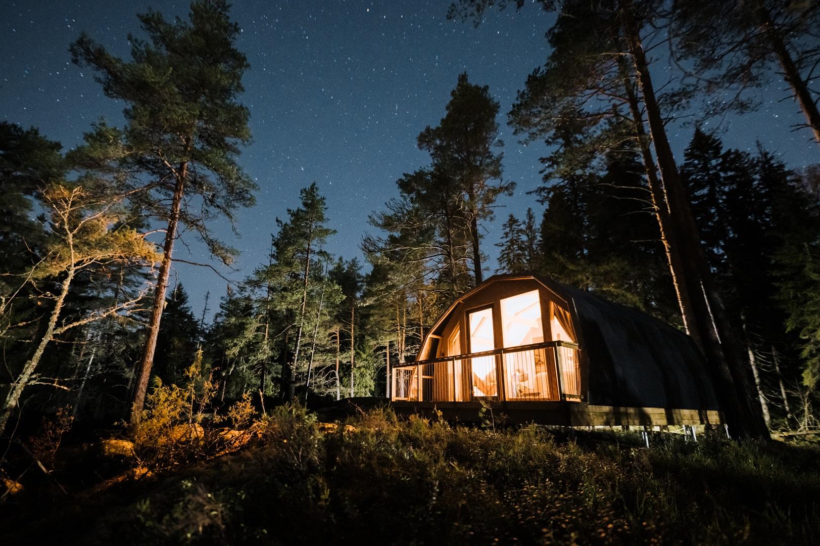 FI: Haltia Lake Lodgen Glamping-teltta yöllä. Valaistun teltan ympärillä on puita.