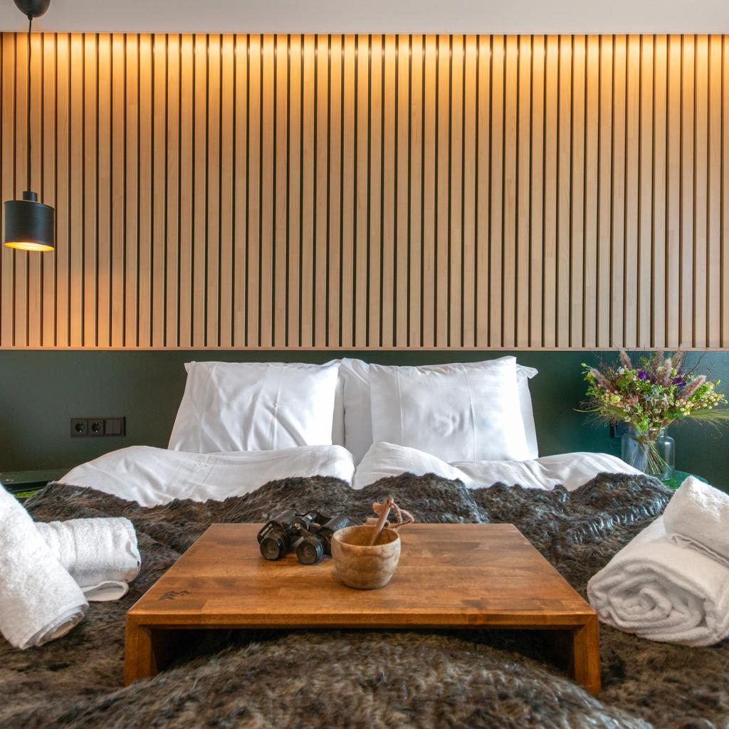 Majoitusvaihtoehtoina ovat pohjoismaisen pelkistetysti sisustetut hotellihuoneet sekä uniikit Lodge Glamping -luksusteltat, jotka tuovat luonnon aivan vierelle ilman mukavuudesta tinkimistä. Jokaisessa majoitusvaihtoehdossa on panostettu hyvään uneen, rauhaan ja yksityisyyteen.
