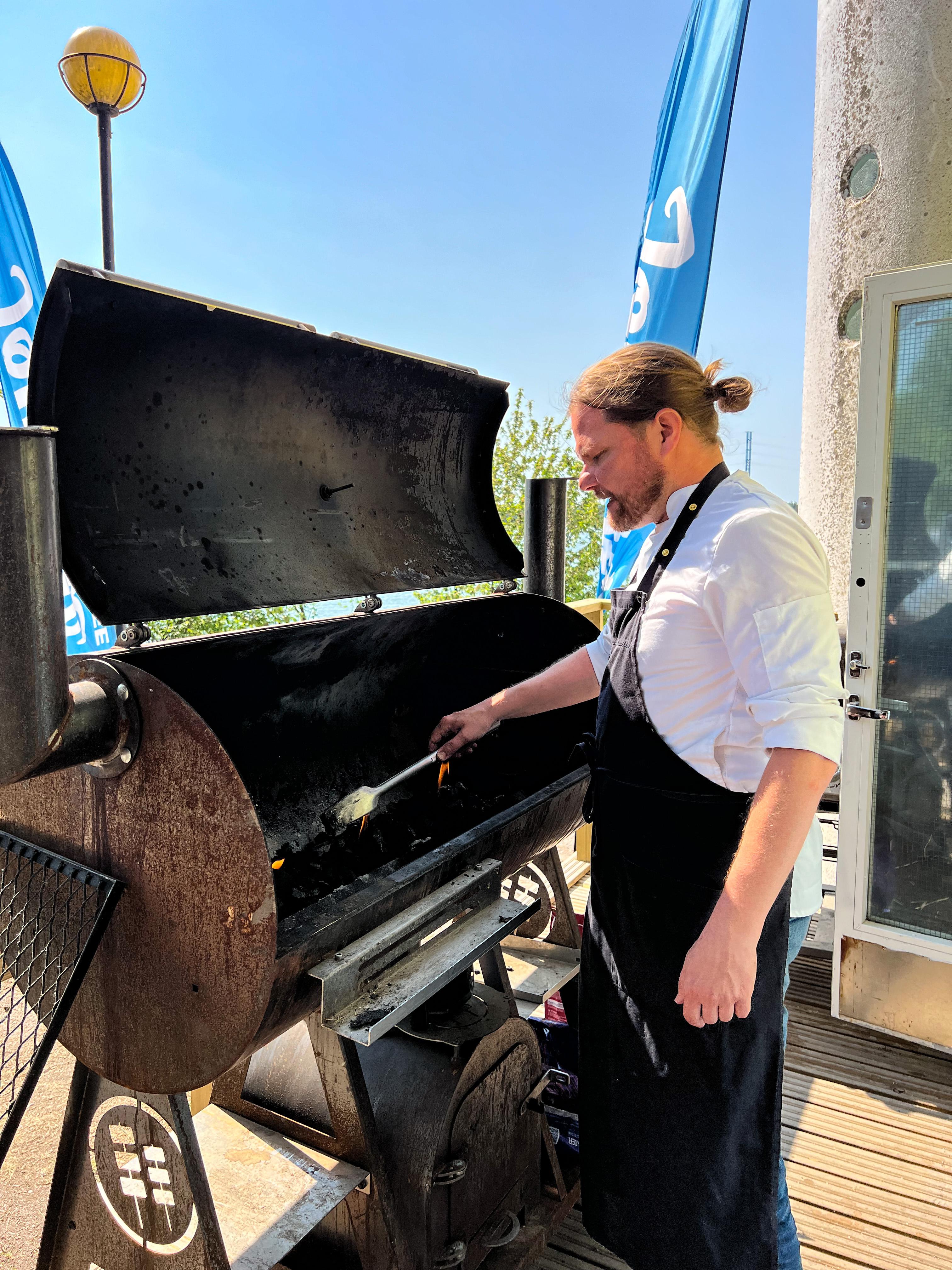 SV: En person står framför en grill.