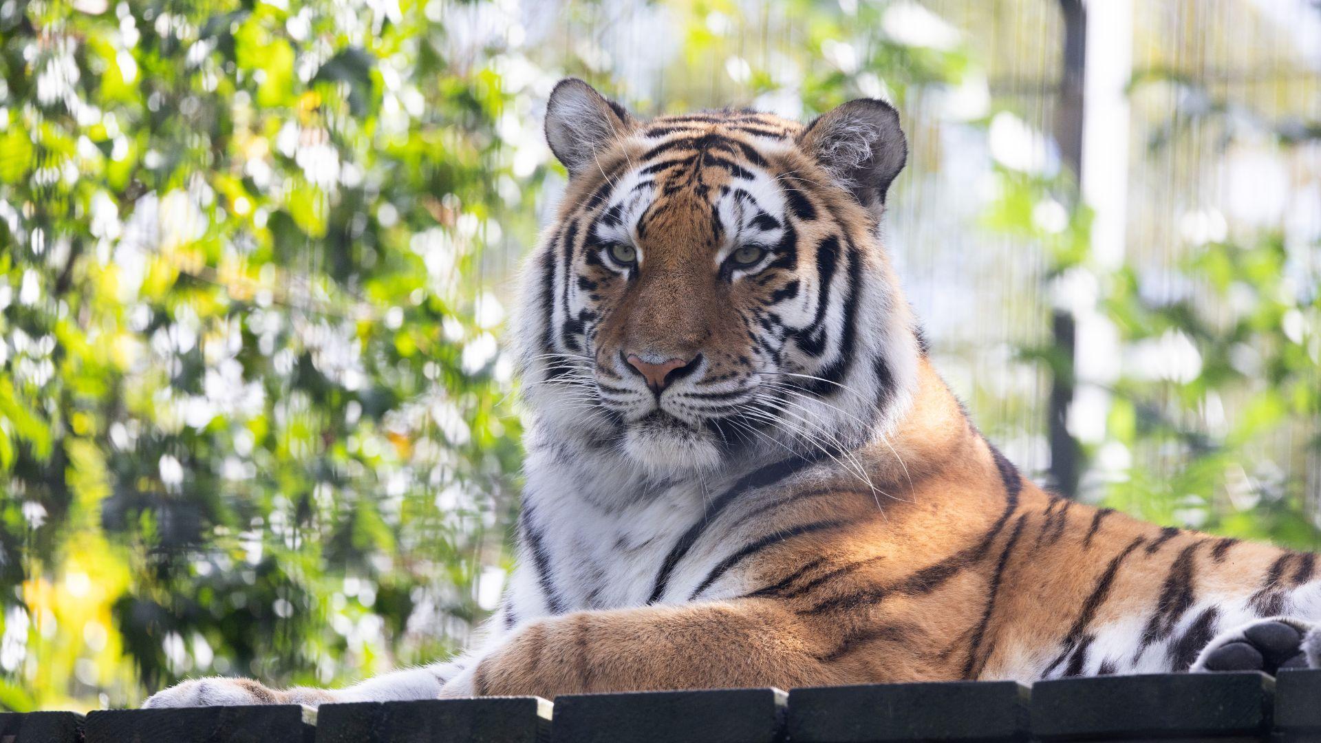 SV: På bilden syns en amurtiger, ock bakom finns gröna växter.