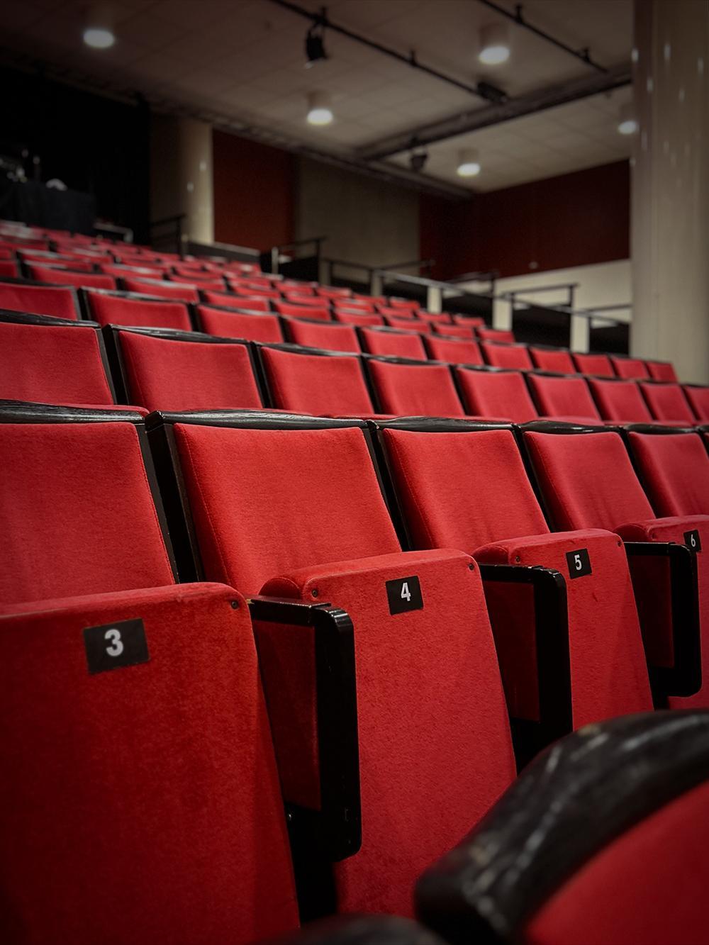 FI: Kuva KOM-teatterin Hakaniemen katsomosta. Katsomossa on punaisia tuoleja.