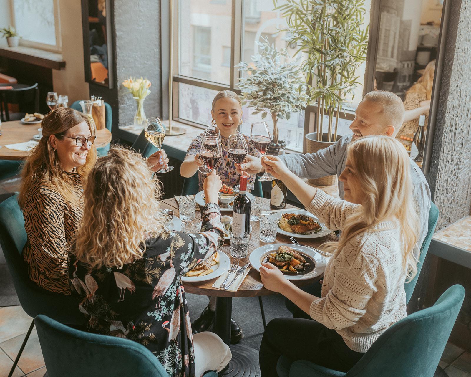 EN: Restaurant Oiva's interior. People are sitting around a table with glasses in their hands.