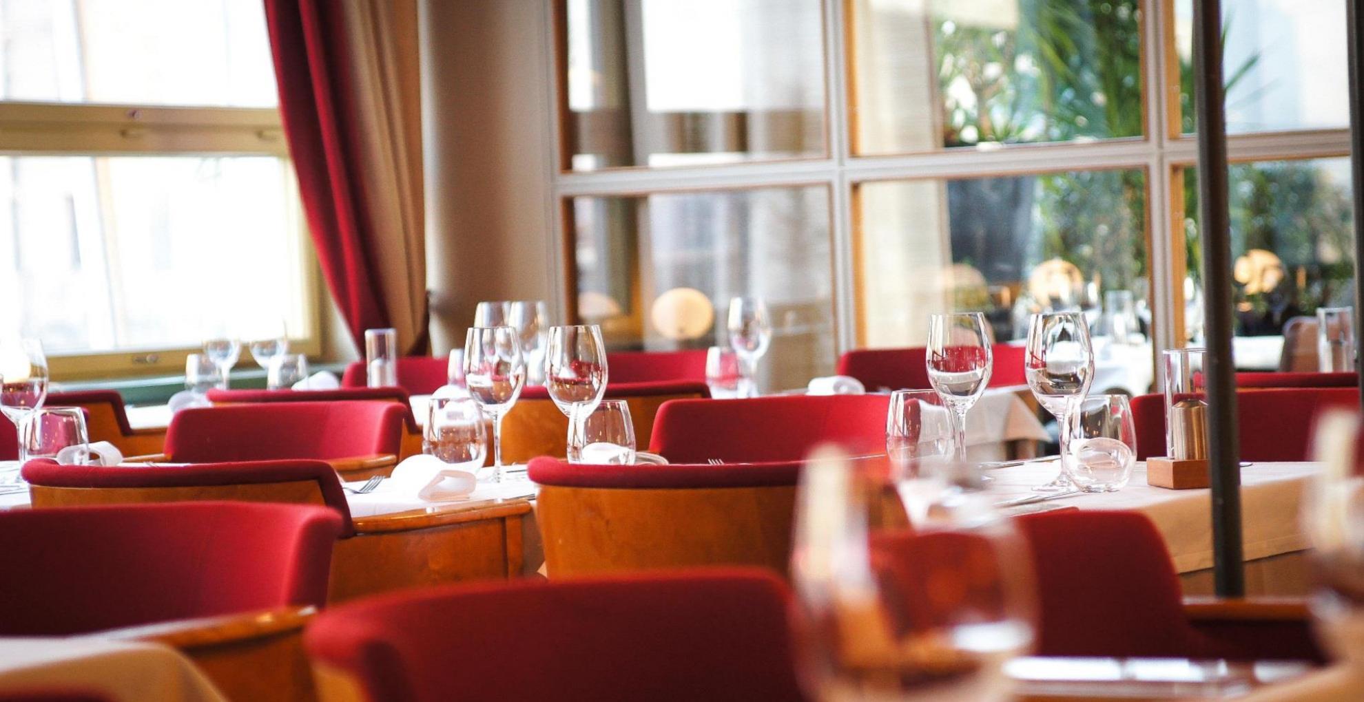 SV: Restaurang Lasipalatsis interiör. I restaurangsalen syns dukade bord och fönster.