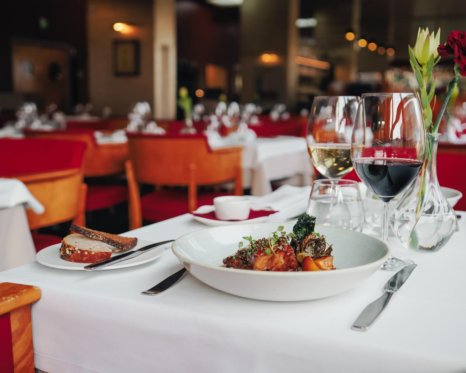 SV: Restaurang Lasipalatsin restaurangsal, där det syns ett dukat bord med en maträtt och drycker ovanpå.