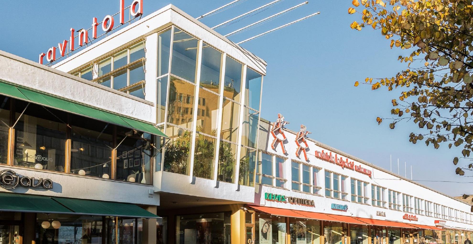 EN: Restaurant Lasipalatsi seen from the outside. On the white bulding, the word Ravintola is written with red letters.